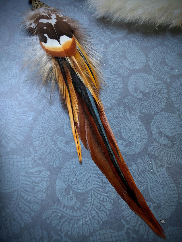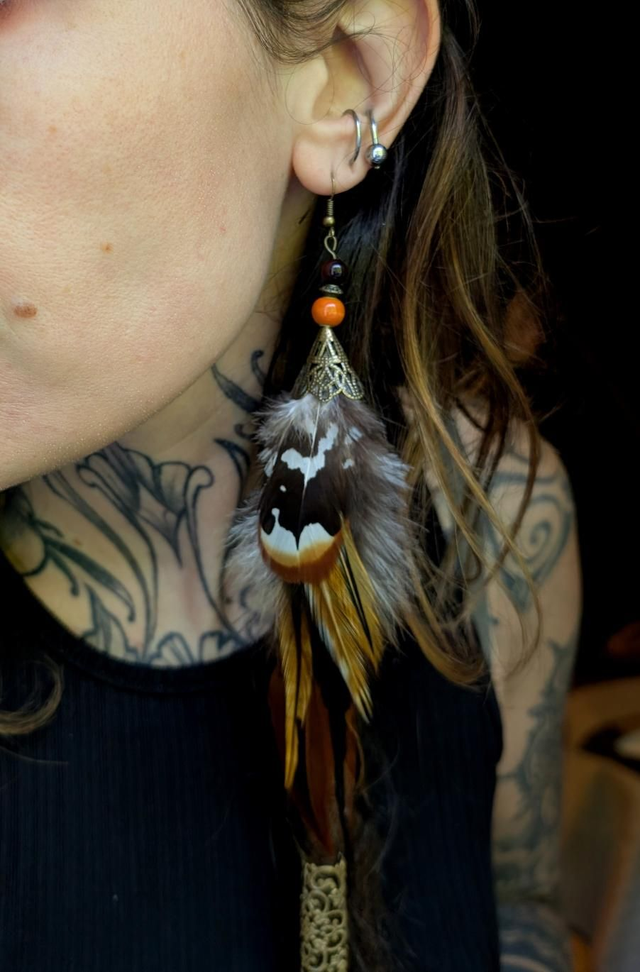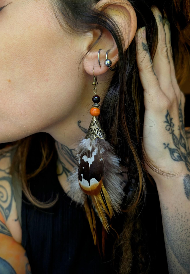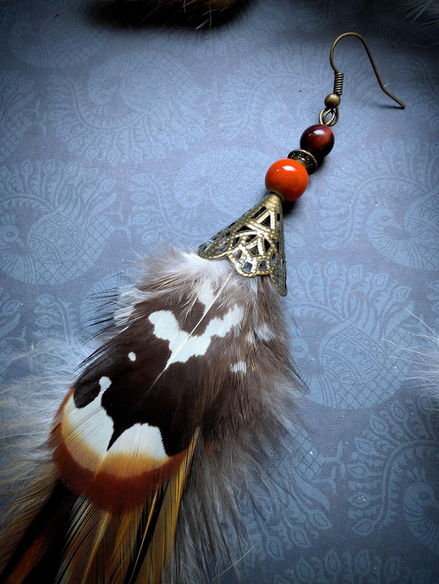 Cette Solitaire s’ancre dans une palette chaude et vibrante : plumes cuivrées et fauves, touches de noir profond, et perles aux reflets d’ambre, de bois et d’ocre rouge.
