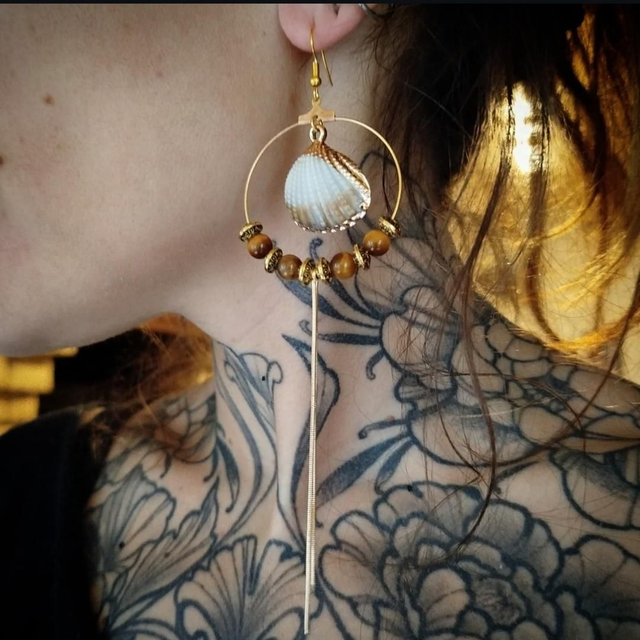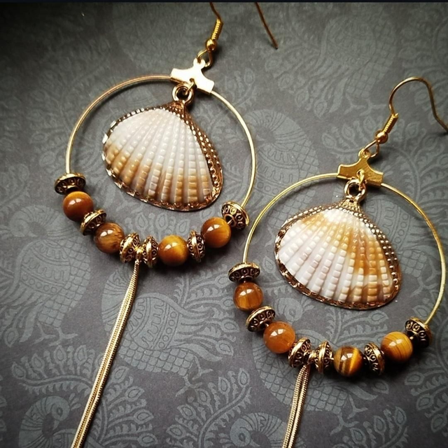Boucles d'oreilles composées d'un coquillage. Elles sont agrémentées d'une petite chaînette et de perles en acryliques irisées aux jolies couleurs de l'oeil de tigre.