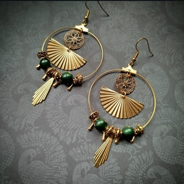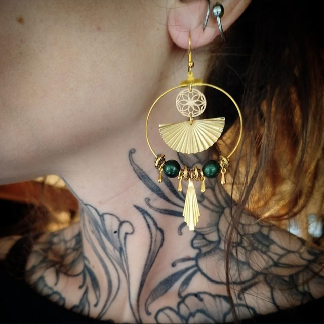 Les boucles Anahita sont une ode à l’eau, à la douceur et à l’harmonie. Le bleu-vert des perles rappelle les lagons paisibles, contrastant avec l’éclat doré du métal martelé. La fleur de vie apporte spiritualité délicate, tandis que les pampilles dansent avec grâce à chaque mouvement. Un bijou apaisant, élégant et chargé d’équilibre, inspiré par la puissance fluide des déesses aquatiques.