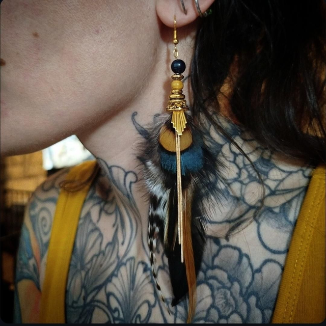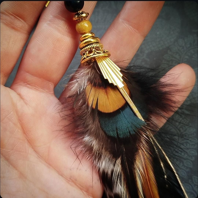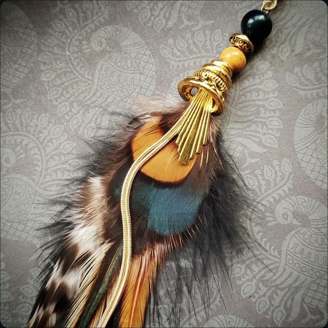 Solitaire composée de faisan et de coq, elle est agrémentée de breloques ethniques , d'une chaînette et de perles couleur crème en céramique et bleu pétrol en acrylique.