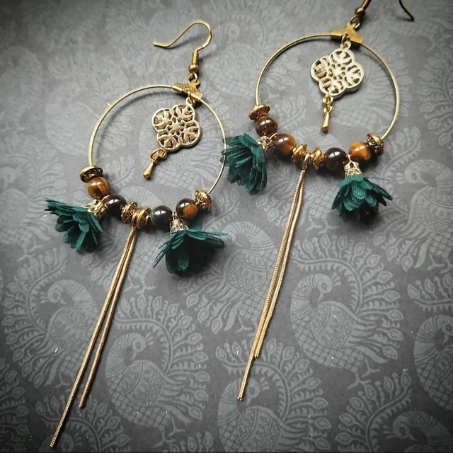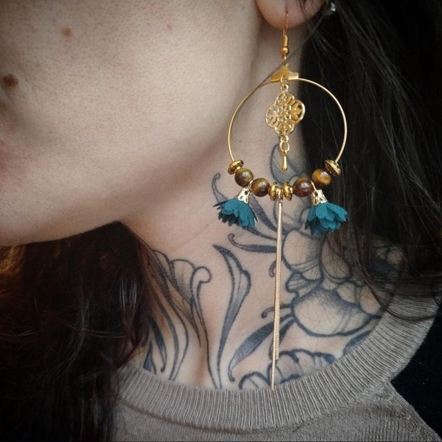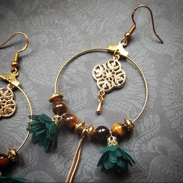 Boucles d'oreilles composées de créoles dorées décorées d'une petite chaînette, de petits pompons bleu pétrole et de perles en acryliques irisées aux jolies couleurs de l'oeil de tigre.