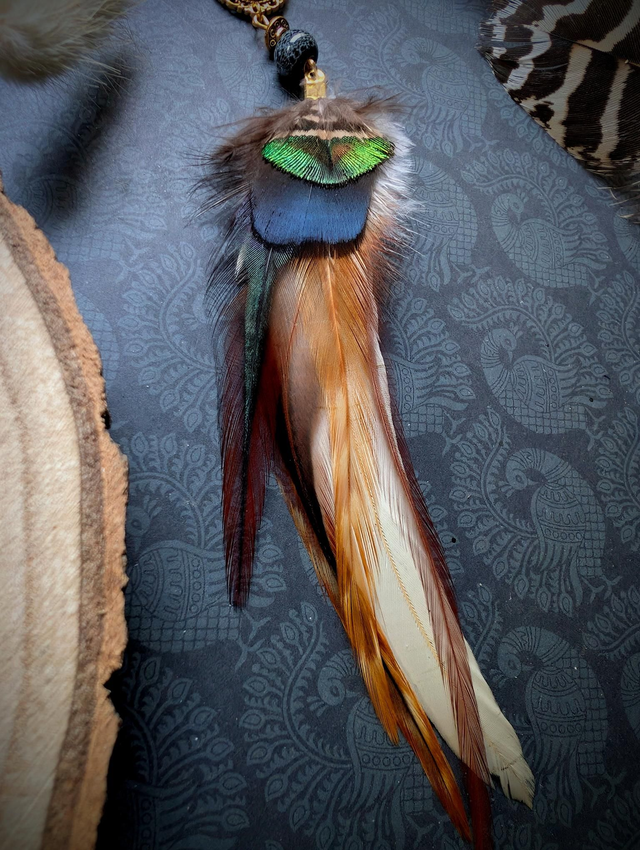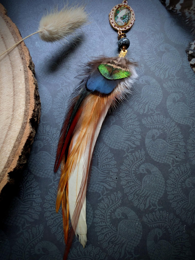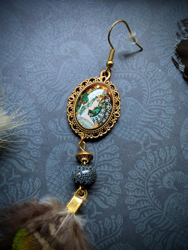 Cette solitaire associe un médaillon raffiné illustré d’une scène florale de Mucha, à des perles minérales sombres, presque volcaniques. Les plumes déployées, aux teintes vertes, rousses et ivoire, semblent capturer le mouvement d’une danse naturelle. Un bijou aérien, vibrant d’énergie organique, qui invite à célébrer l’art, la nature et la liberté.