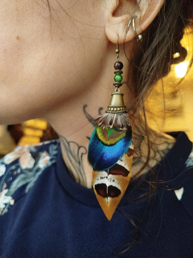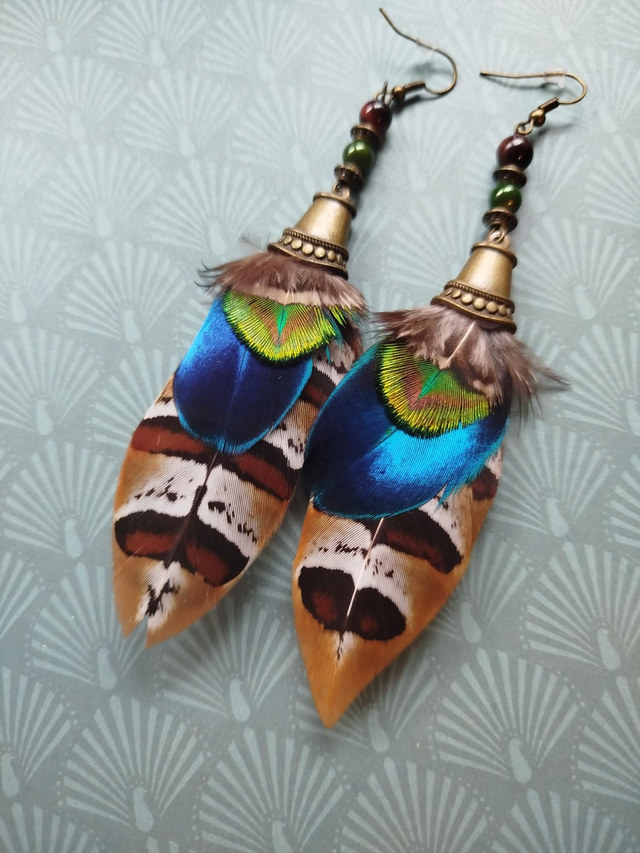 Boucles d'oreilles composées de plumes de paon et de faisan avec d'incroyables reflets quand la lumière frappe dessus. Elles sont agrémentées d'une breloque ethnique et d'une perle en acrylique et céramique.