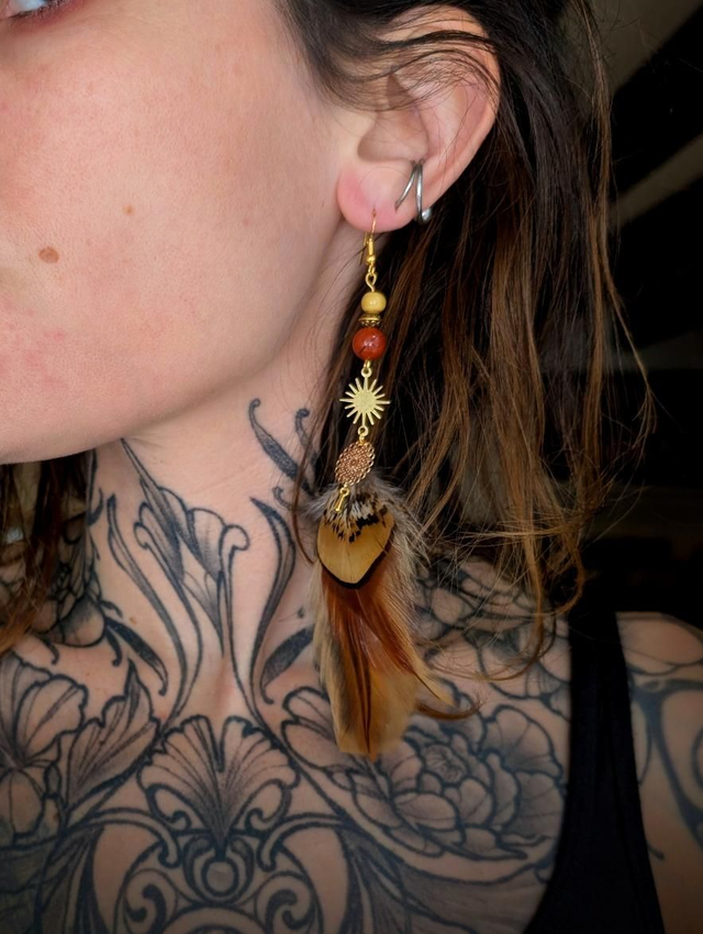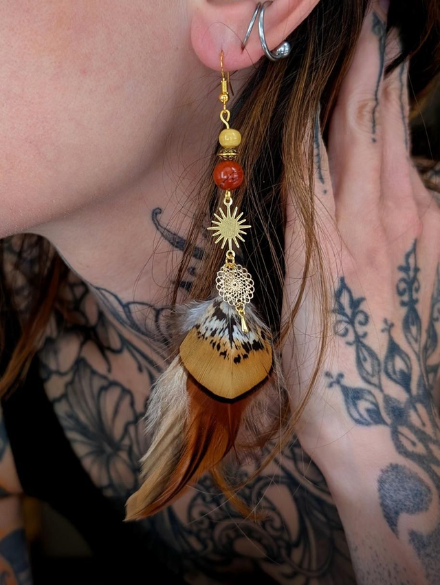 Brume Dorée est une étreinte entre la chaleur du soleil et le mystère des brumes matinales. Composée de plumes légères aux teintes dorées, brunes et cuivrées, elle semble flotter entre deux mondes : celui de la matière et celui des rêves. Elle capte la lumière, la filtre, et l’adoucit comme un voile sacré posé sur la peau.