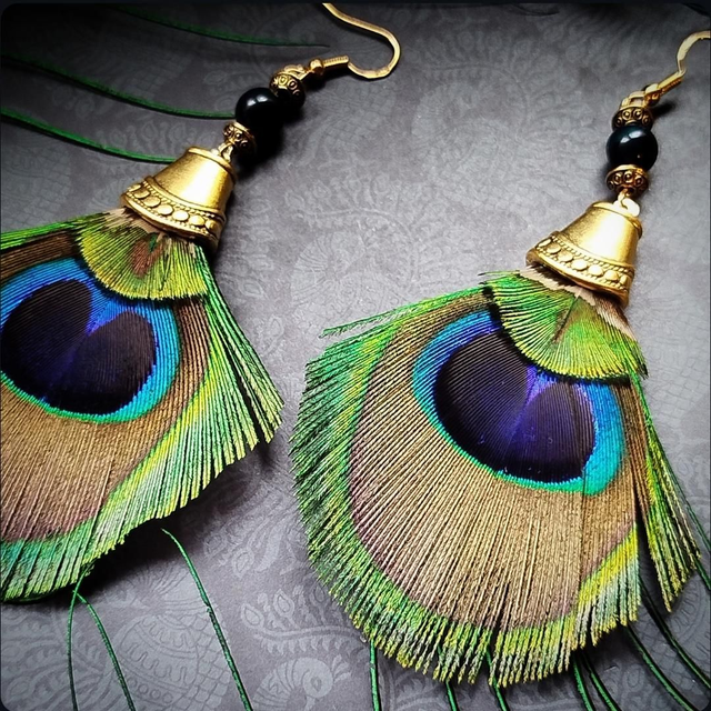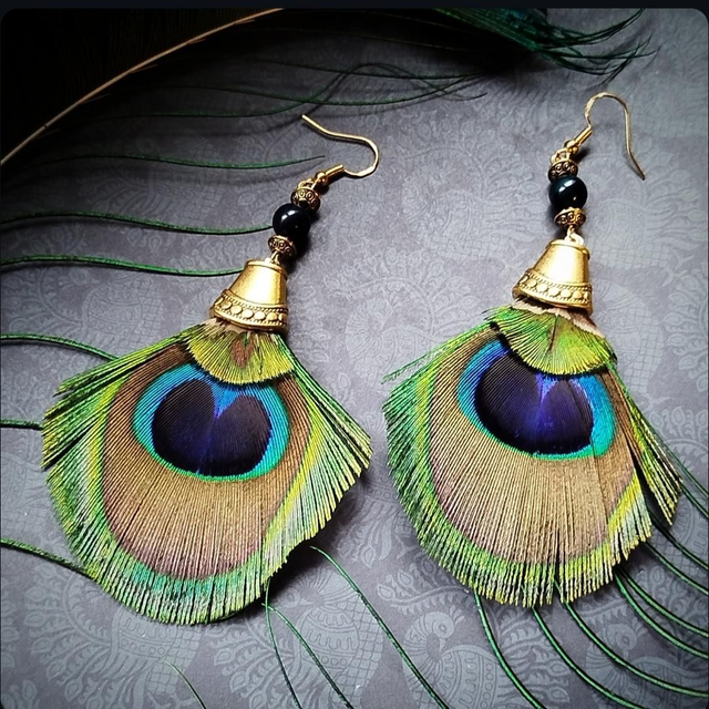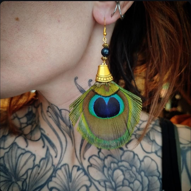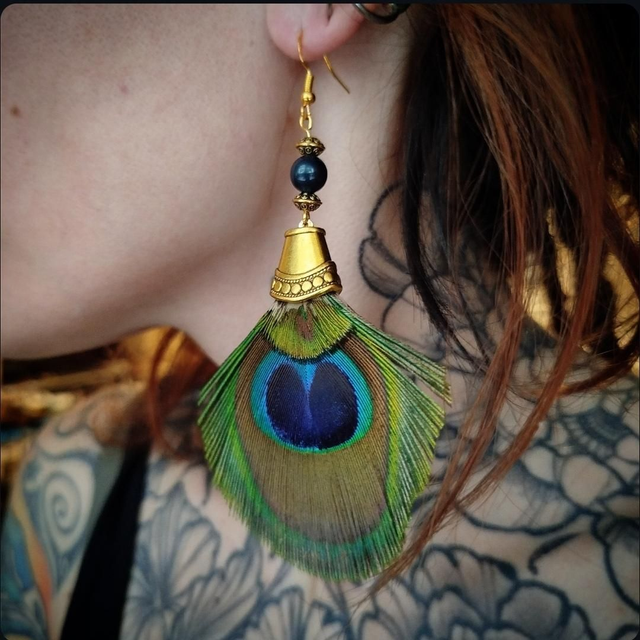 Ces boucles d'oreilles sont faites avec les plumes de mes paons, Loki et Curly qui me font cadeau chaque été de ces merveilles.