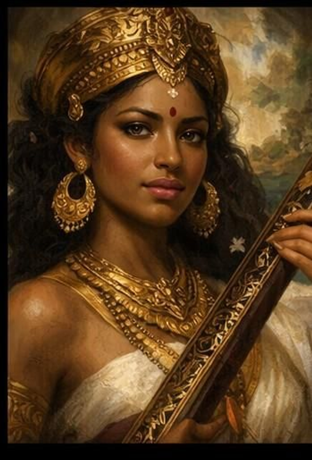 Déesse hindoue de la connaissance et de la création, Saraswati incarne la clarté d’esprit et l’expression créative.