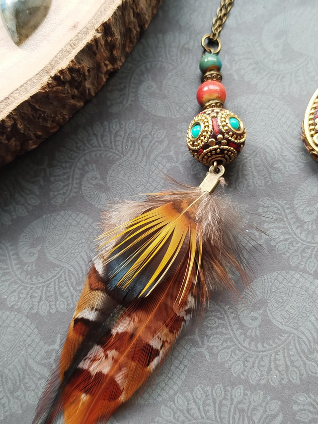 Ce sautoir au style tibétain incarne l’élégance naturelle et l’authenticité des traditions artisanales. Composé d’une fine chaîne , il est sublimé par une perle tibétaine finement ouvragée et un pendentif orné de plume de coq et de faisan.