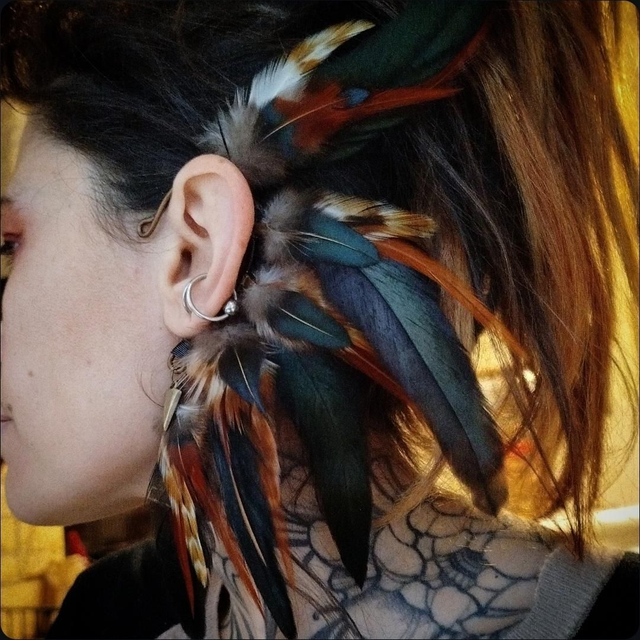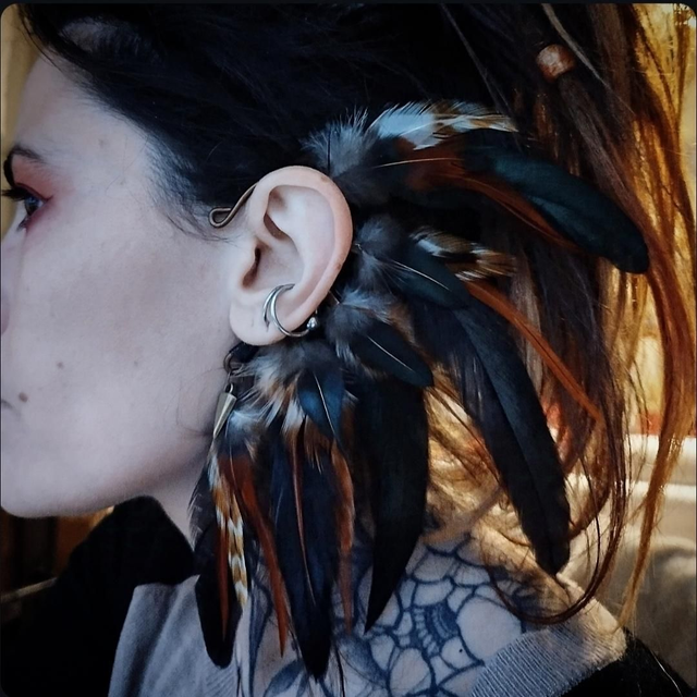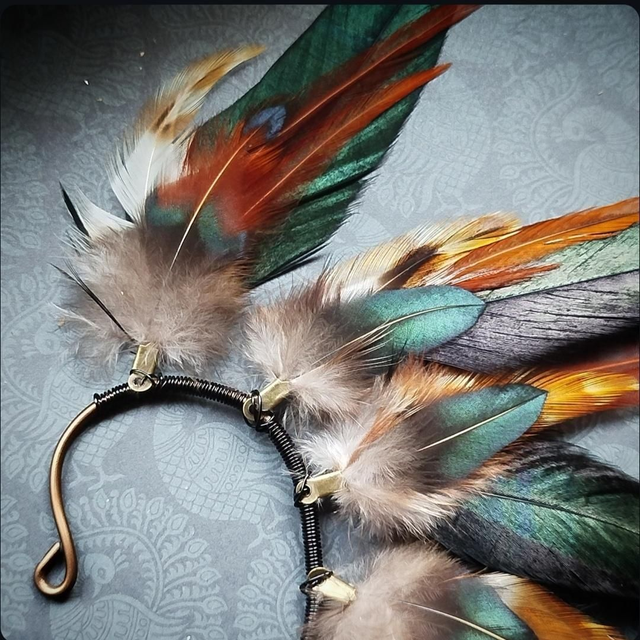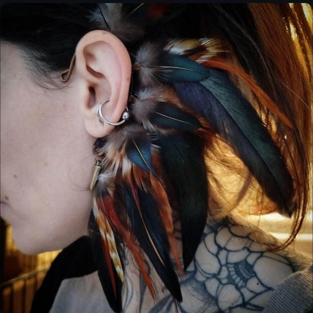 Cette Earcuff est composée de plumes coq, de magnifiques reflets vert métalliques lorsque la lumière frappe dessus.