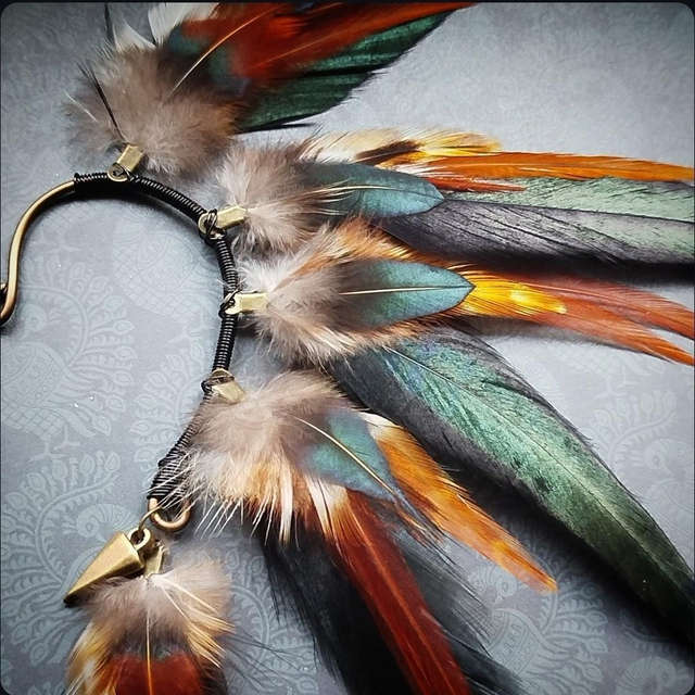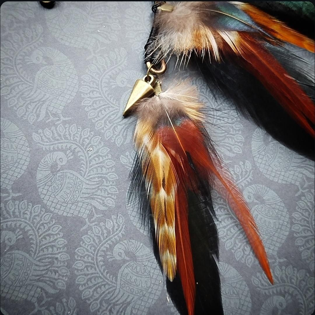 Les plumes sont montées sur un fil en aluminium très léger de couleur bronze et réglable en fonction de votre oreille. Une petite breloque en forme de pointe est attaché en bas.