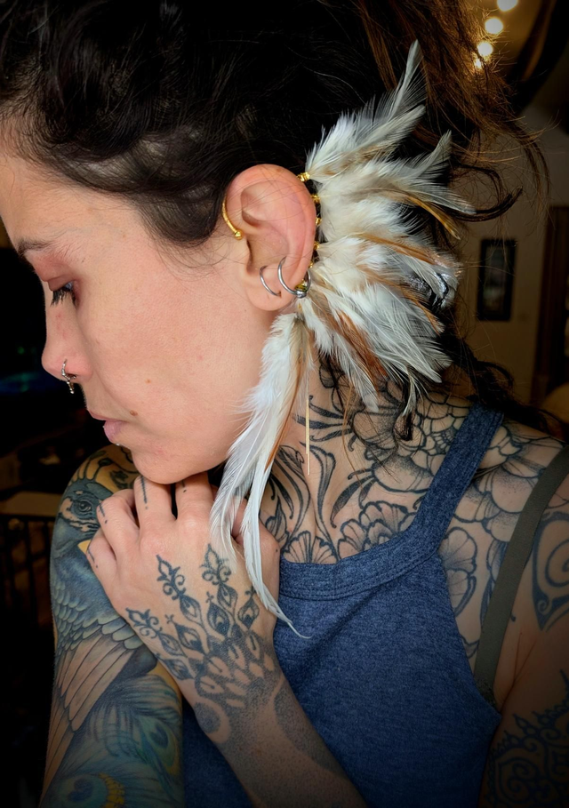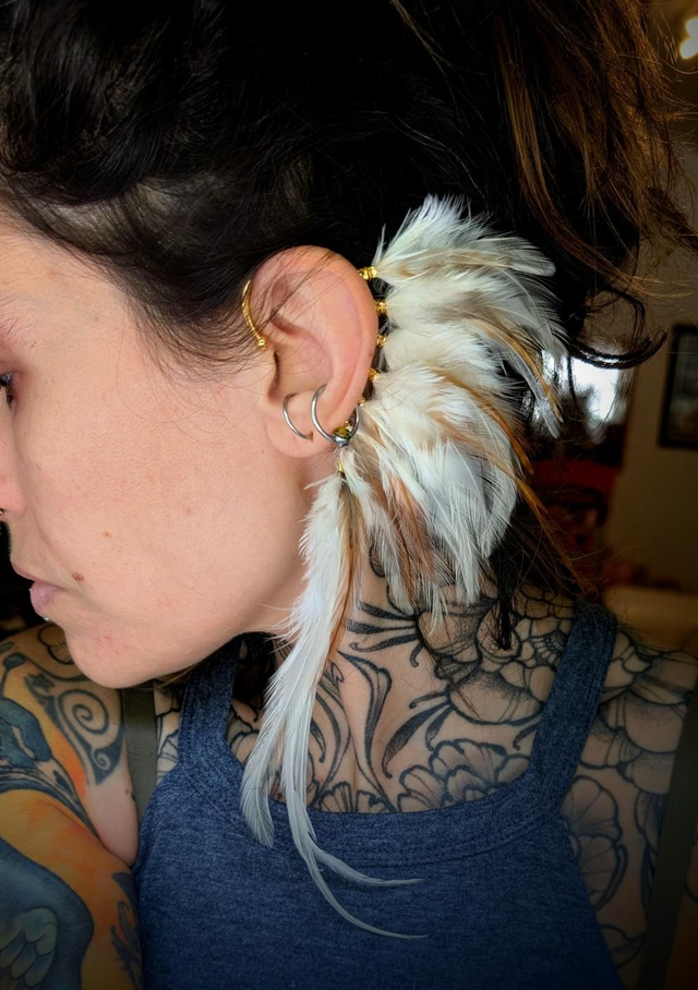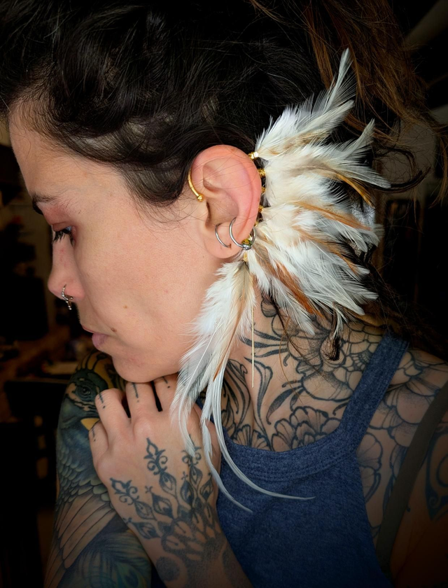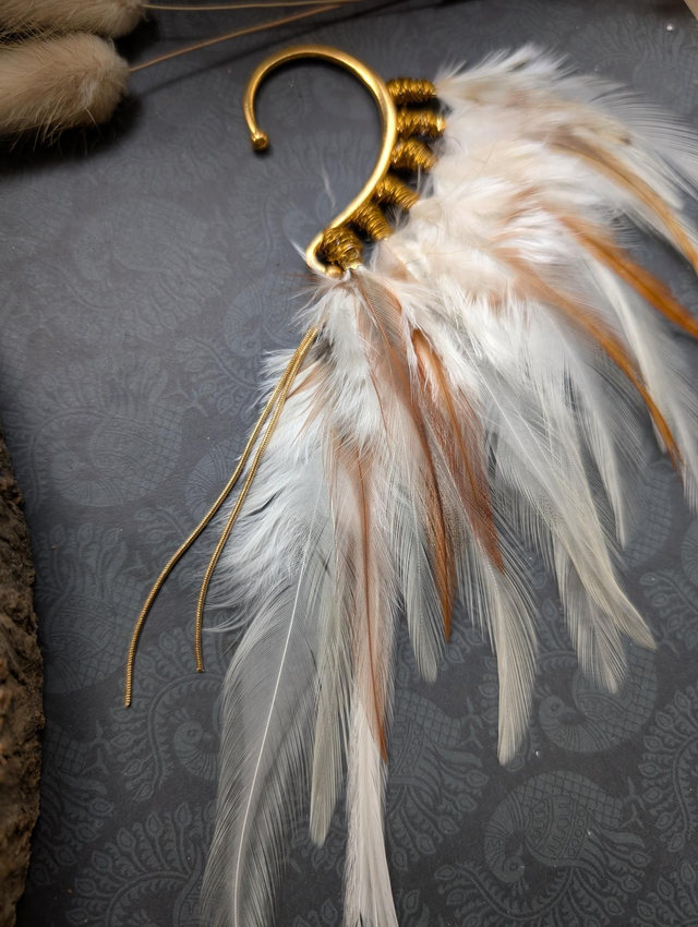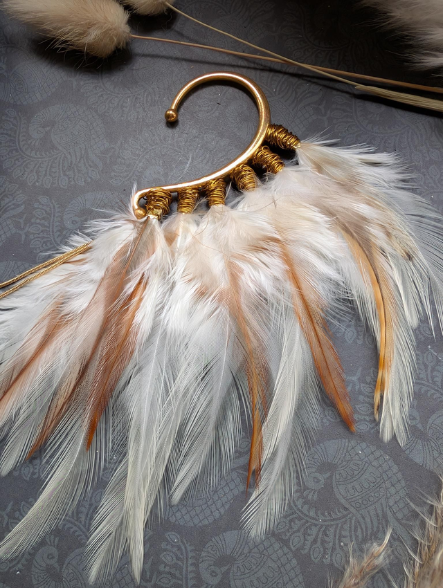 Tiva est un earcuff cérémonial, inspiré des danses tribales qui célèbrent l’union entre l’humain et la nature. Son crochet doré, serti de fils enroulés avec soin, soutient une cascade de plumes aux nuances chaudes — ivoire, cannelle et sable — rappelant les couleurs du désert au coucher du soleil.