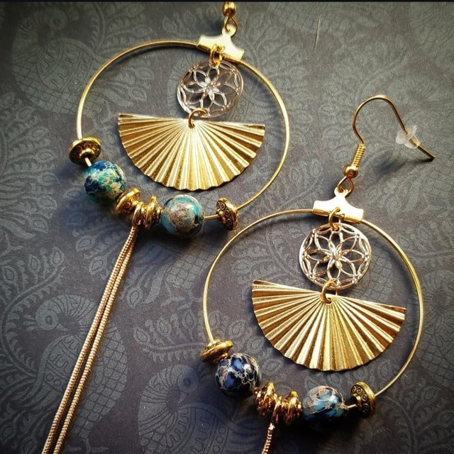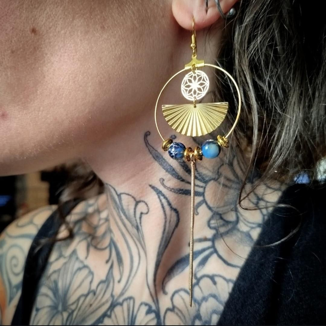 Boucles d'oreilles composées d'un éventail doré. Elles sont agrémentées de perles en acryliques marbrées aux jolies couleurs bleue.