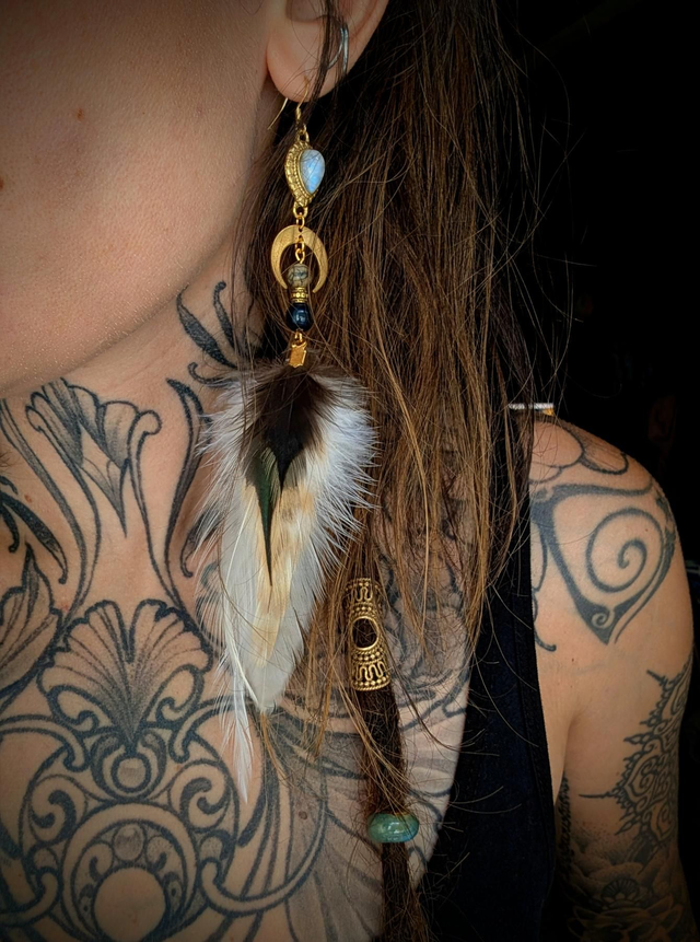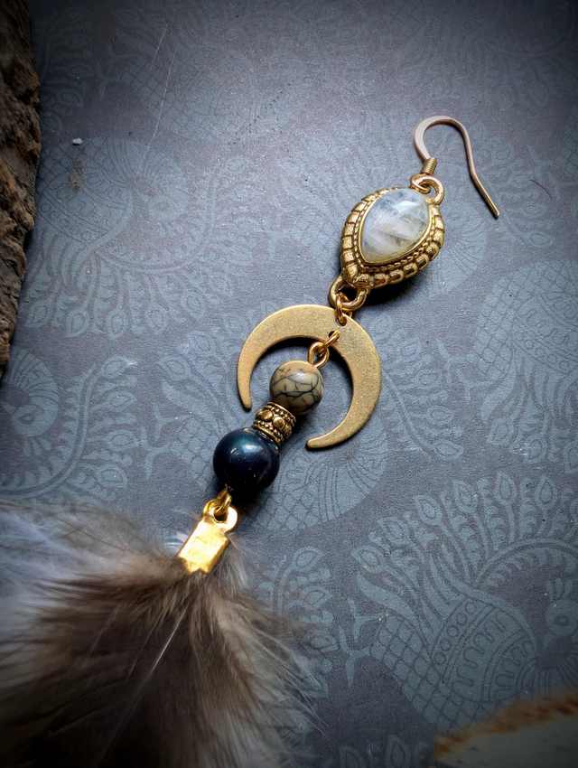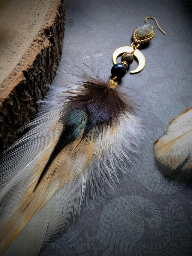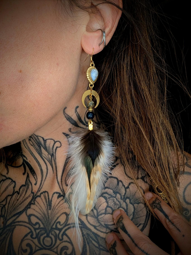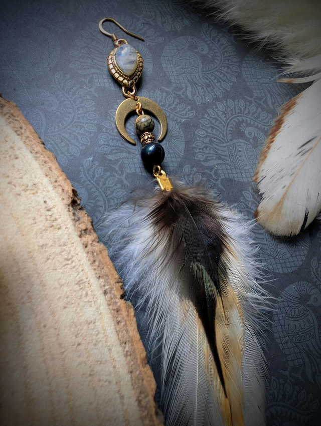 Ses plumes blanches associées à la pierre de lune rappellent la forêt enneigée, les paysages silencieux où tout renaît après le repos de l’hiver.