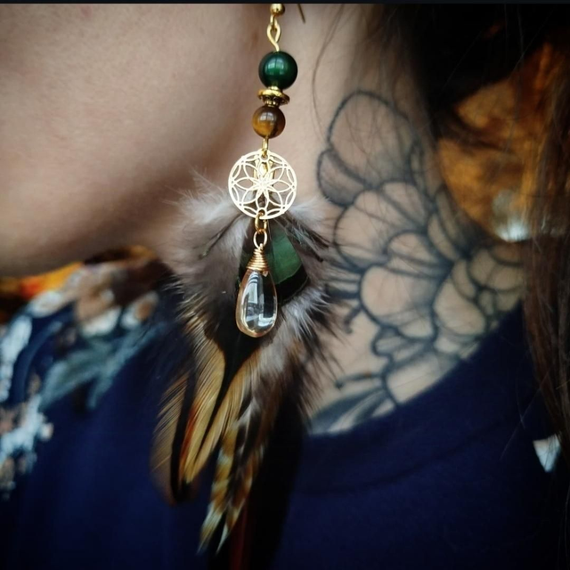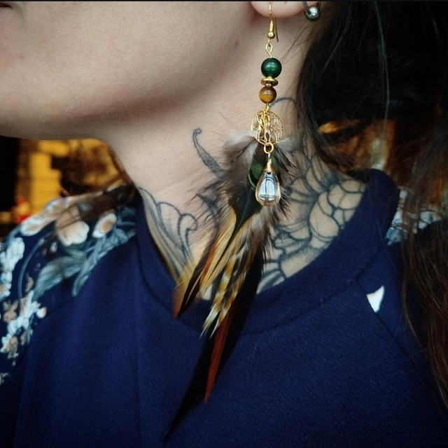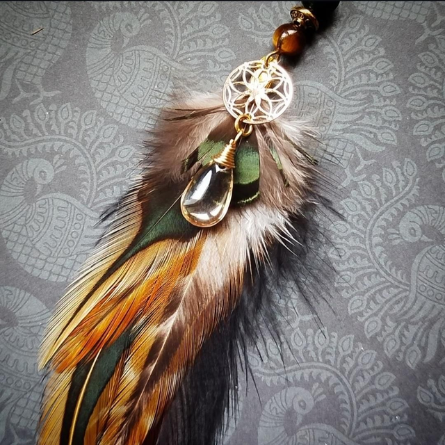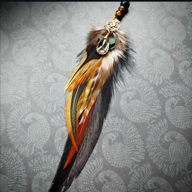 Solitaire composée de plumes de faisan et de coq, elle est agrémentée d'une breloque ethnique, d'une perle en acrylique et céramique et une pampille en verre.