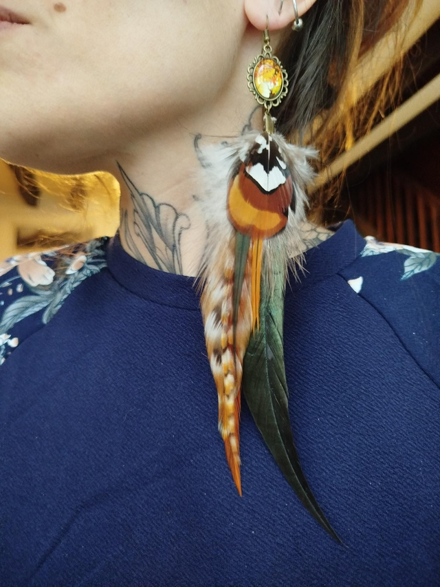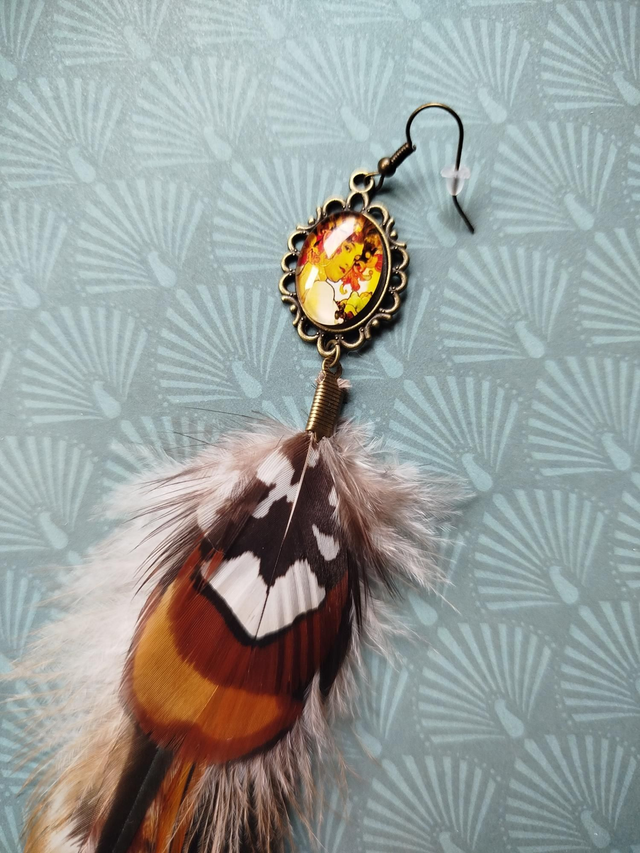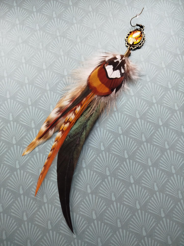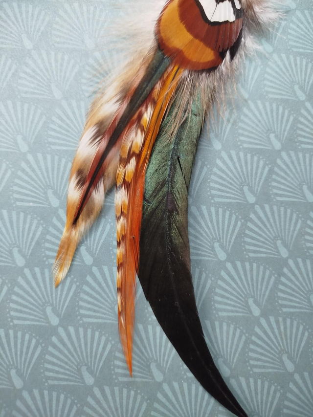 Solitaire composée de plumes de paon de faisan et de coq, elle est agrémentée d'un cabochon en verre Mucha et d'une perle en céramique. Munie d'un petit stoppeur sur l'attache pour ne pas la perdre. Sa longueur totale est de 23 cm.