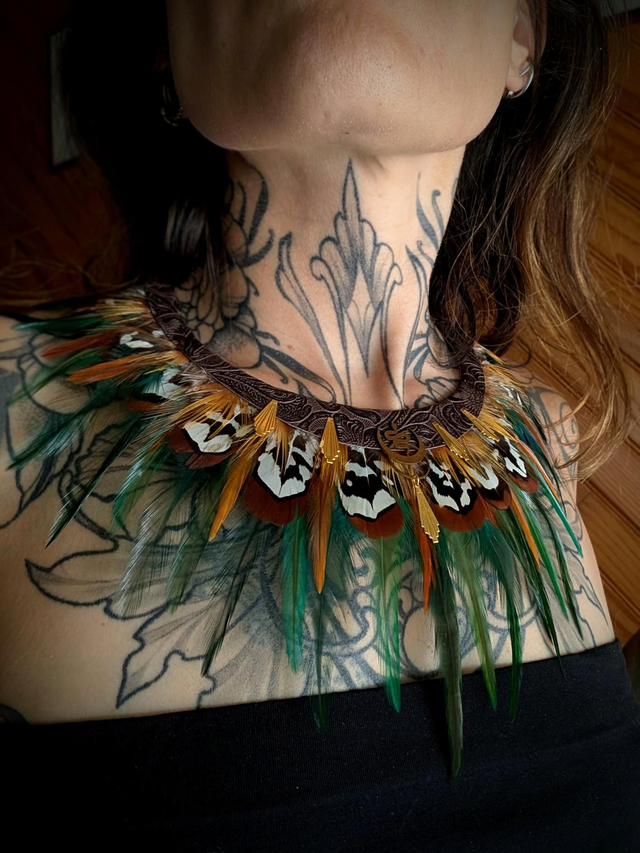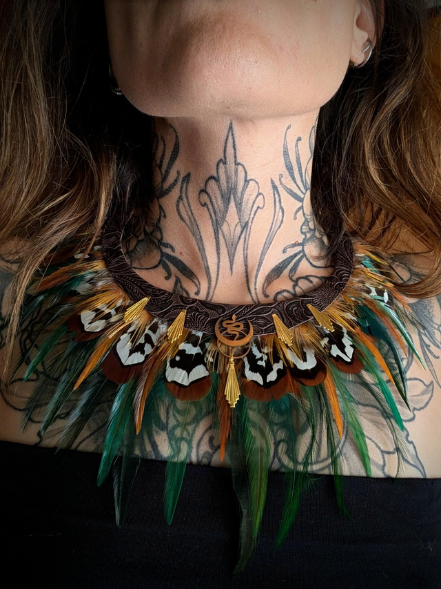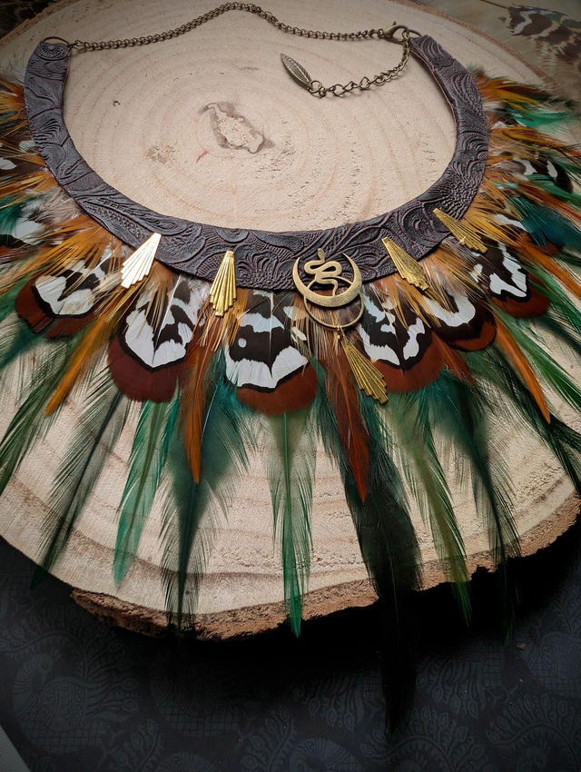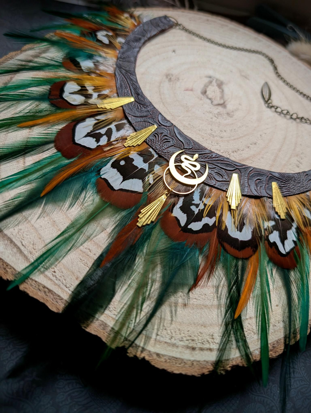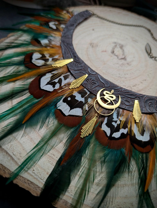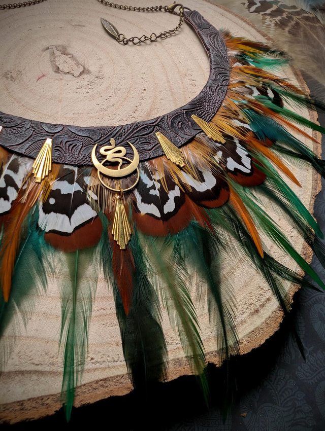 Un bijou talisman inspiré des esprits protecteurs de la forêt. Ses plumes aux motifs contrastés — vert, orange, brun et blanc — s’unissent à des touches dorées pour créer un équilibre entre force et harmonie.