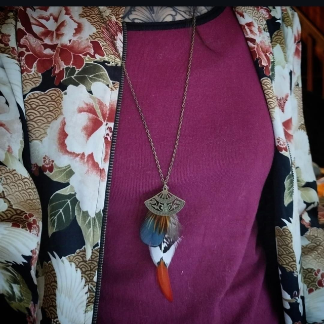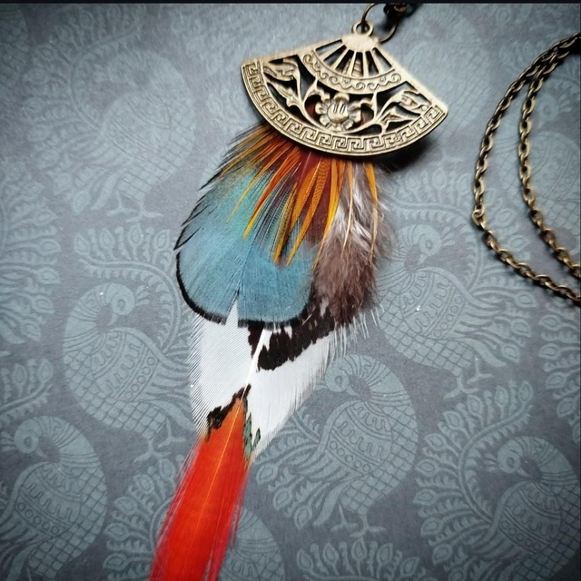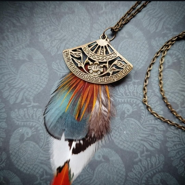 Collier type sautoir composé de plumes de faisan au couleurs lumineuses, il est agrémenté d'un éventail couleur bronze.