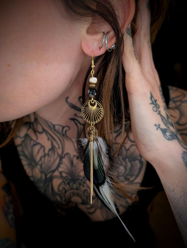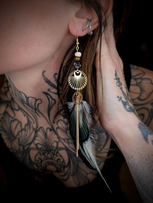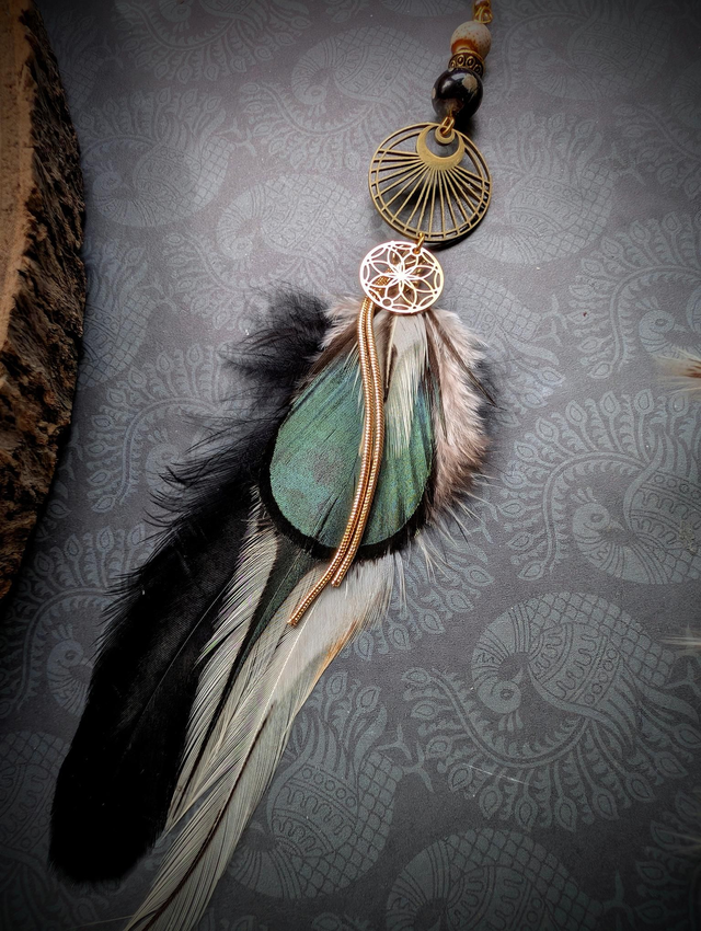 L’Heure Bleue est une création suspendue entre deux mondes, comme ce moment rare où le jour cède sans bruit sa place à la nuit. Faite à partir de plumes de coq et de faisan, ses teintes profondes – bleu nuit, noir velouté, reflets irisés – rappellent les ailes d’un messager céleste glissant entre les brumes du crépuscule.