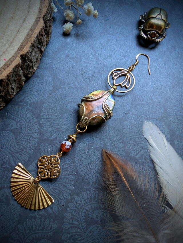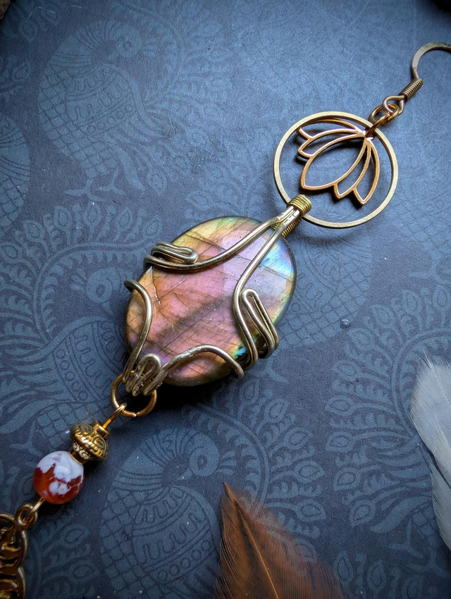 Une petite boucle talisman autour d’une labradorite aux reflets changeants, entourée de fil doré pour la mettre en valeur.