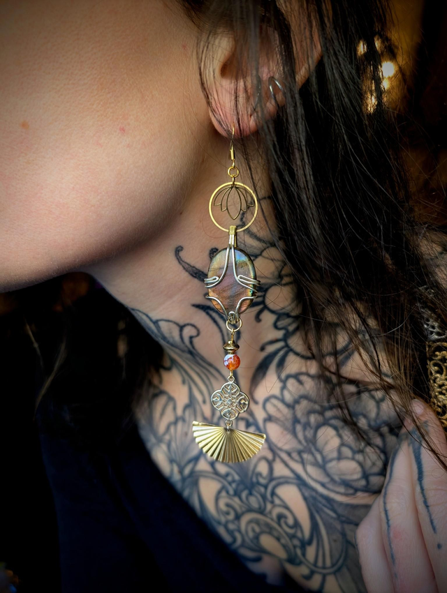 Elle est accompagnée d’une perle d’agate, qui apporte une touche chaleureuse, et d’un pendentif doré en forme d'éventail.