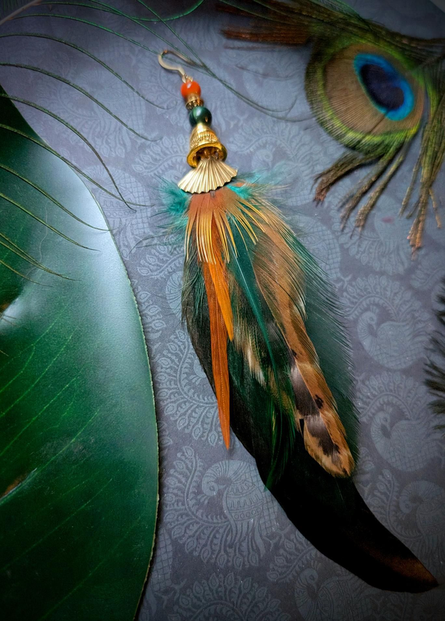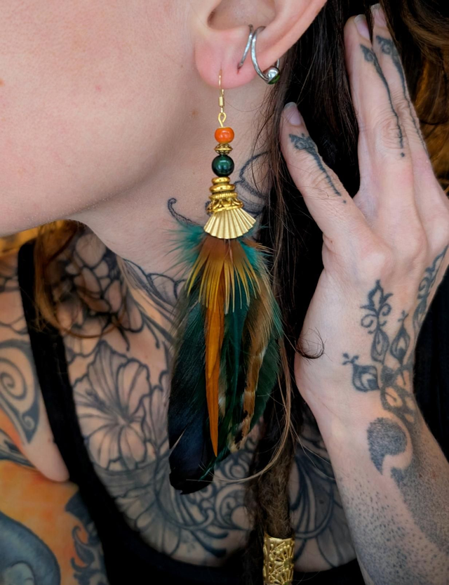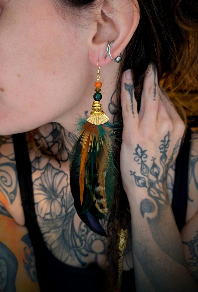 Ses plumes fauves et émeraude dansent comme l’ombre des feuillages sur la peau.