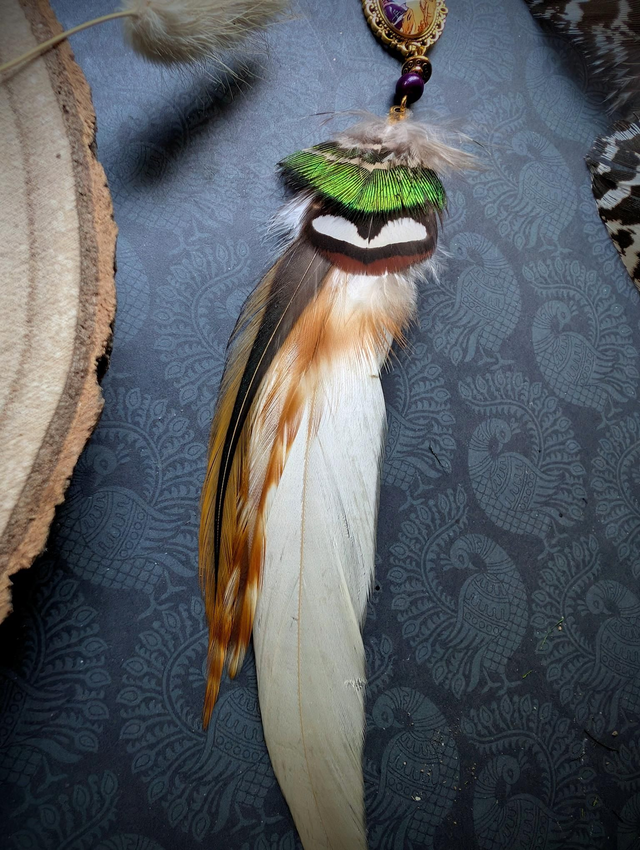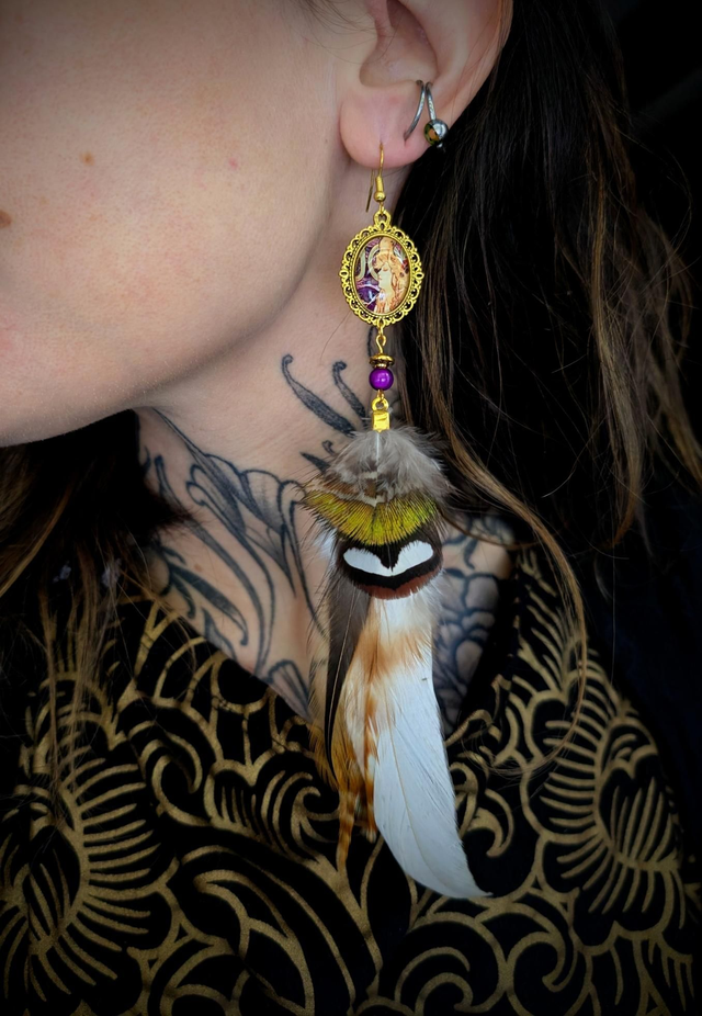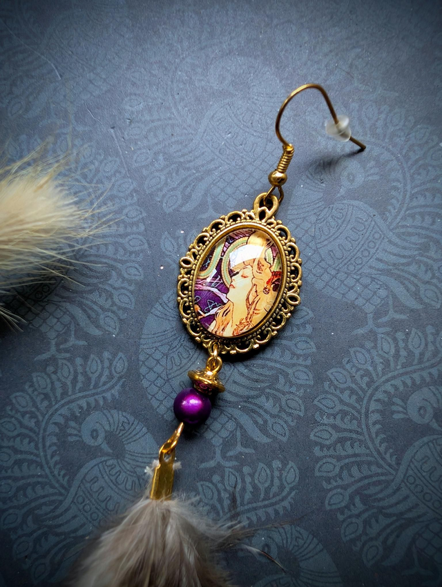 Toute la grâce sensuelle de l’Art nouveau s’exprime dans ce cabochon doré orné d’un portrait de femme au regard mystérieux. Les perles violettes et dorées ajoutent une note royale, tandis que les plumes blanches et brunes s’élancent avec douceur. L’ensemble évoque une muse intemporelle, entre élégance précieuse et envol poétique.