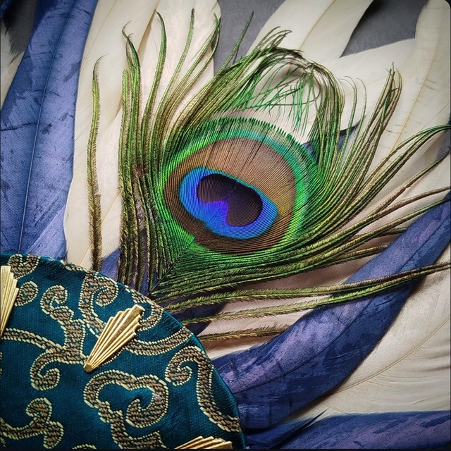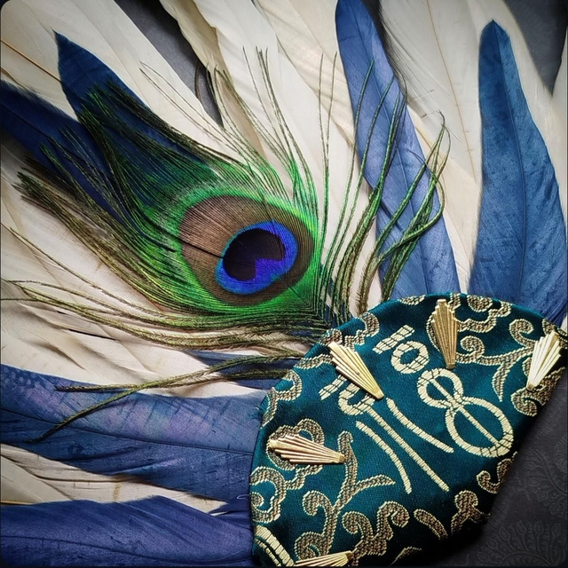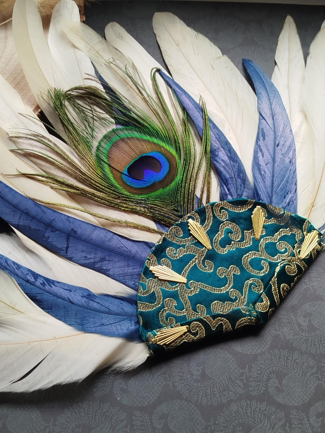 Éventail fait de plumes de coq et de paon , décoré d'un magnifique tissu japonais satiné dans les tons plus canard et doré.