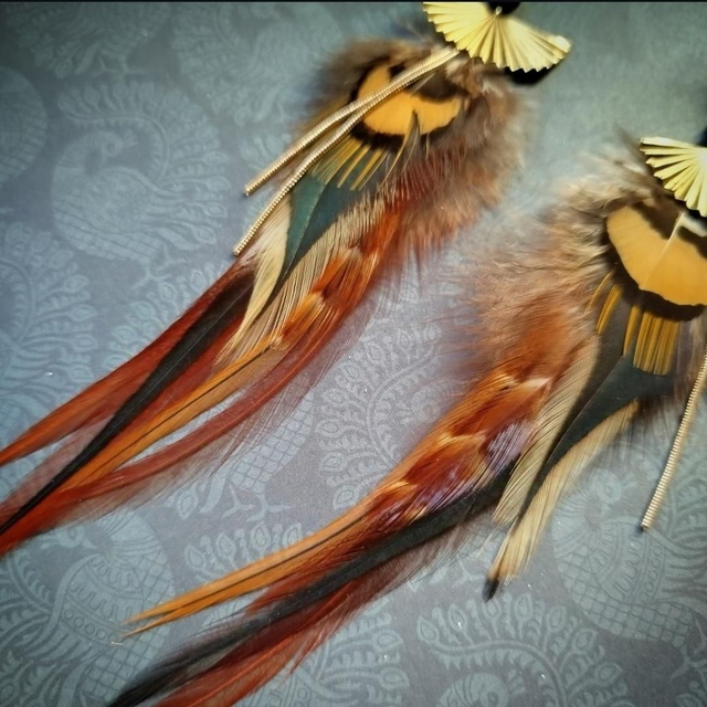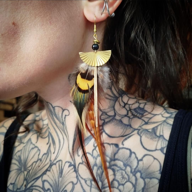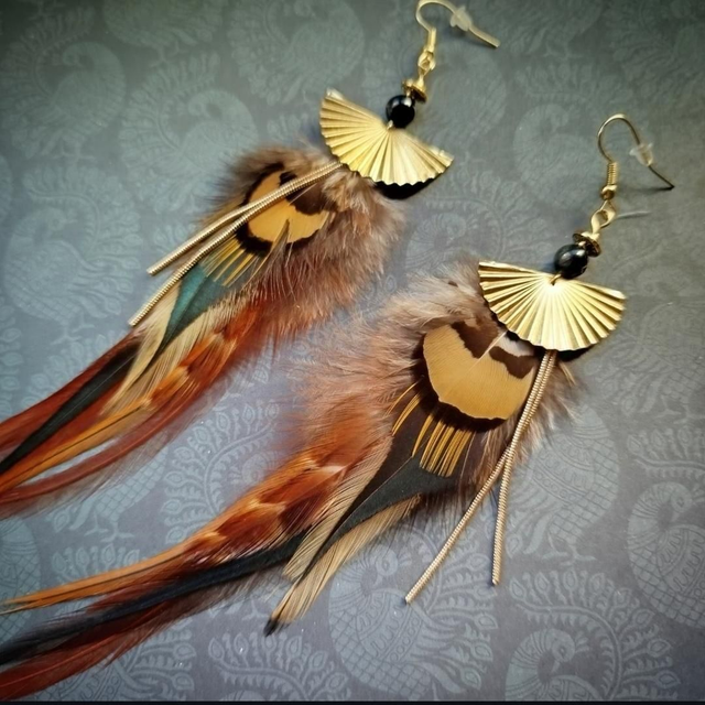 Boucles d'oreilles composées de plumes de coq et faisan avec d'incroyables reflets quand la lumière frappe dessus. Elles sont agrémentées d'un petit éventail, une petite chaînette et d'une perle en acrylique.
