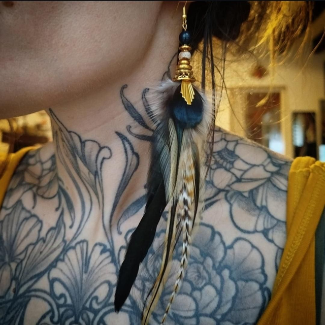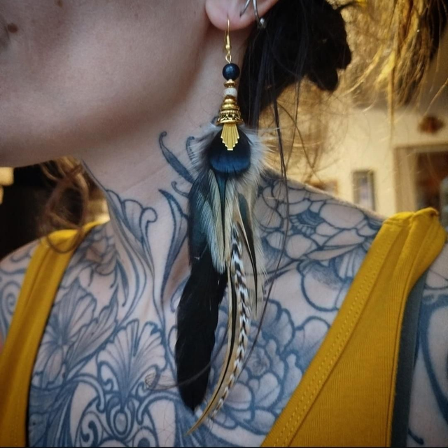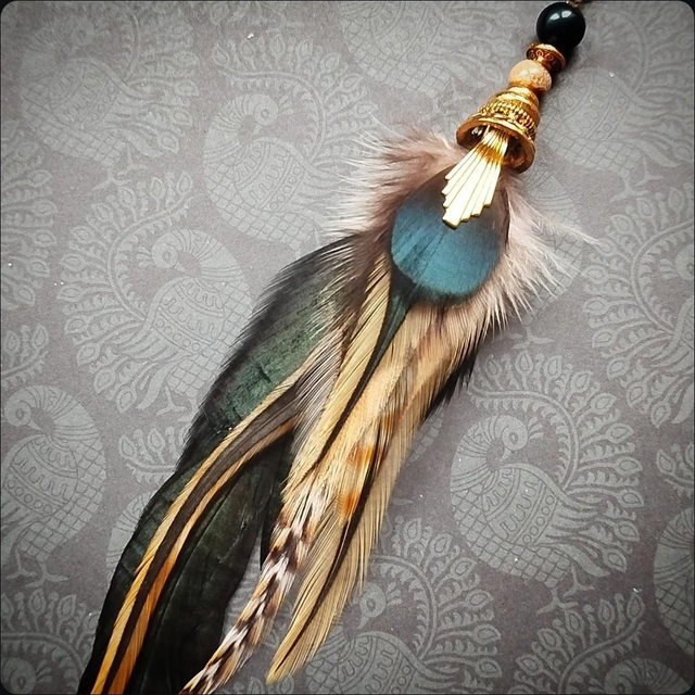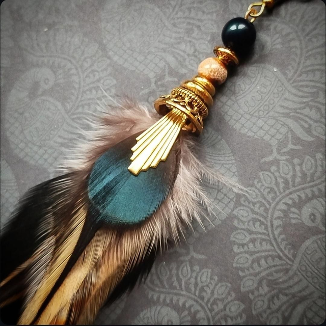 Solitaire composée de faisan et de coq, elle est agrémentée de breloques ethniques et de perles couleur crème en céramique et bleu pétrol en acrylique.