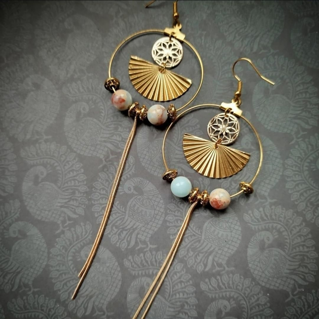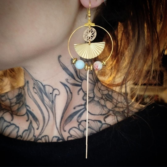 Symbole de lumière et de prospérité, les créoles Lakshmi marient harmonieusement géométrie sacrée et inspiration orientale. La fleur de vie rappelle le lotus, tandis que l’éventail doré capte la lumière comme un soleil stylisé.