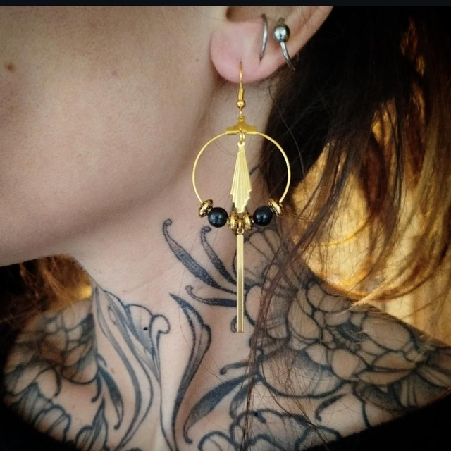 Boucles d'oreilles composées d'un éventail doré. Elles sont agrémentées de perles en acryliques aux jolies couleurs gris/bleu.