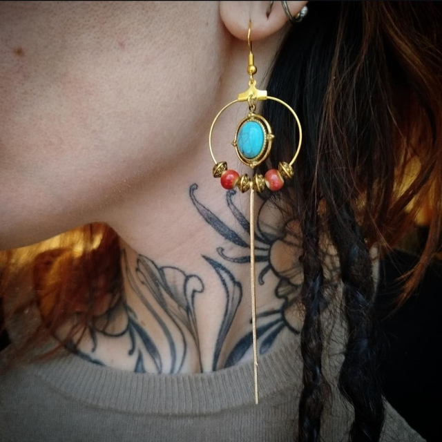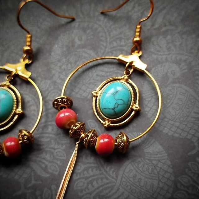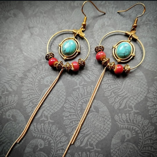 Boucles d'oreilles composées d'un petit cabochon orné d'une Turquoise. Elles sont agrémentées d'une petite chaînette et de perles en céramique de couleur rouge orangé.