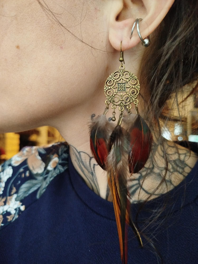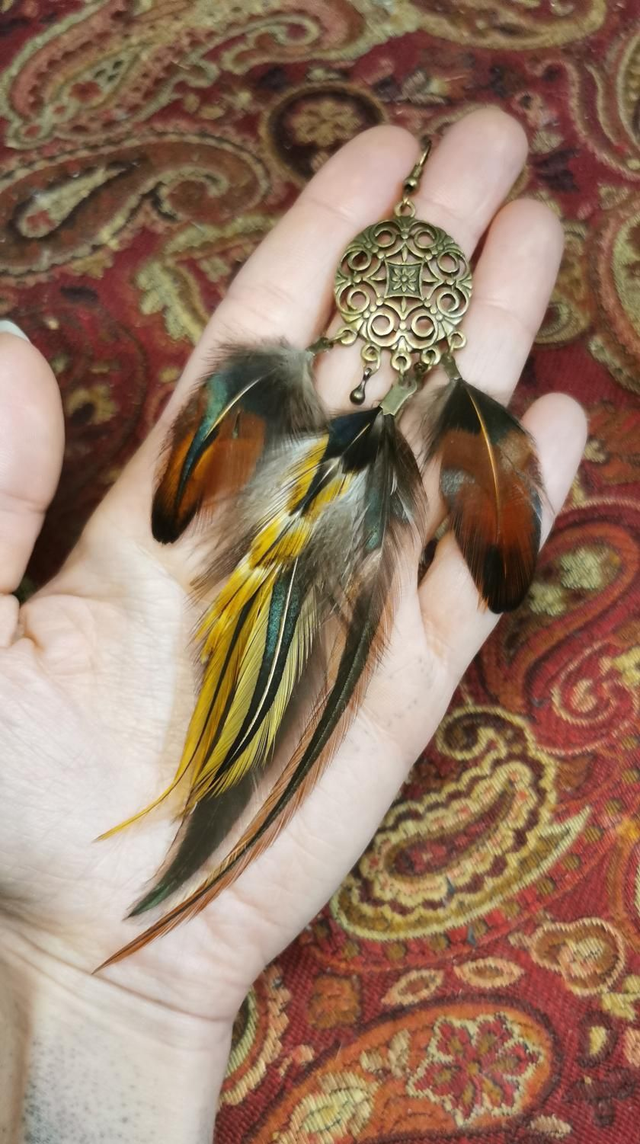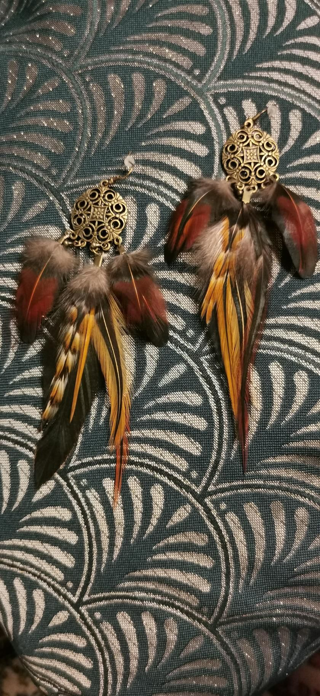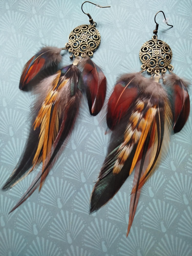 Boucles d'oreilles composées de plumes de coq avec d'incroyables reflets quand la lumière frappe dessus. Elles sont agrémentée d'une breloque ethnique et de pampilles.