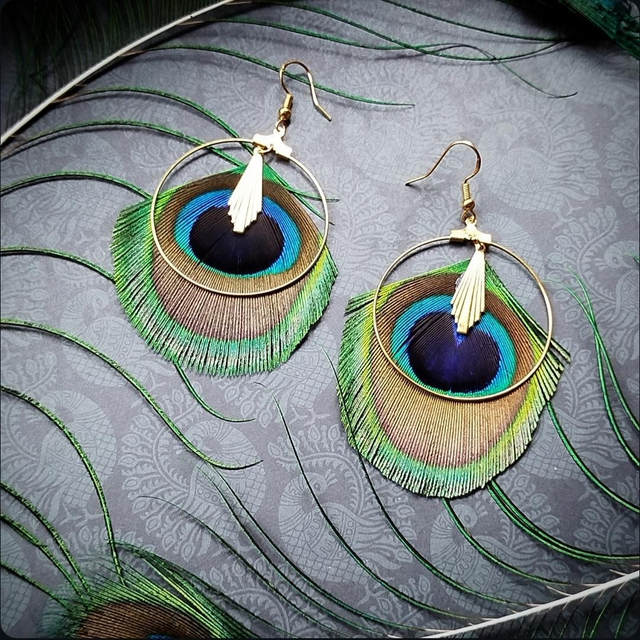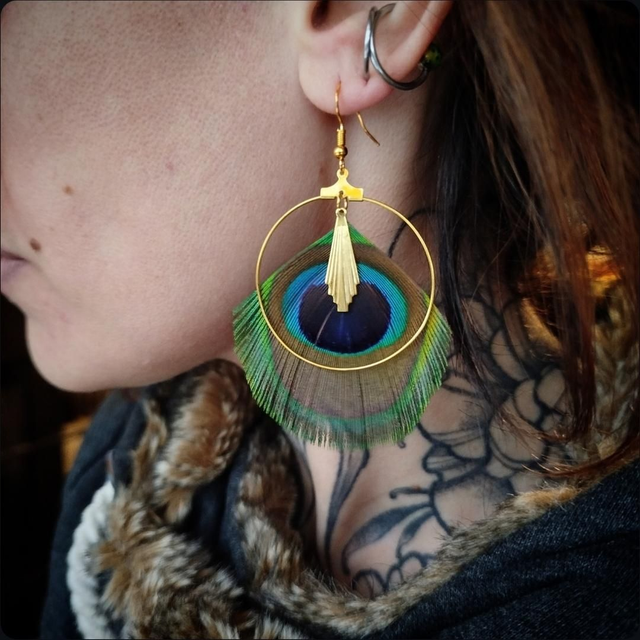 Ces boucles d'oreilles sont faites avec les plumes de mes paons, Loki et Curly qui me font cadeau chaque été de ces merveilles.