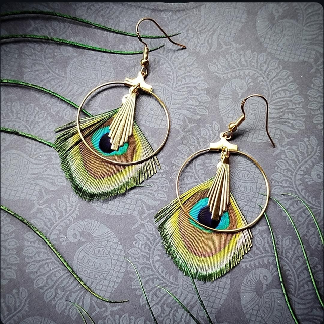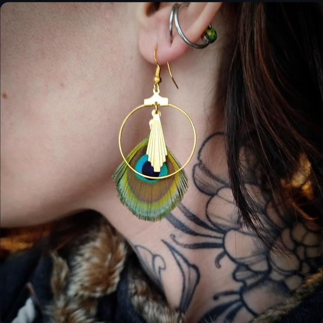 Ces boucles d'oreilles sont faites avec les plumes de mes paons, Loki et Curly qui me font cadeau chaque été de ces merveilles.