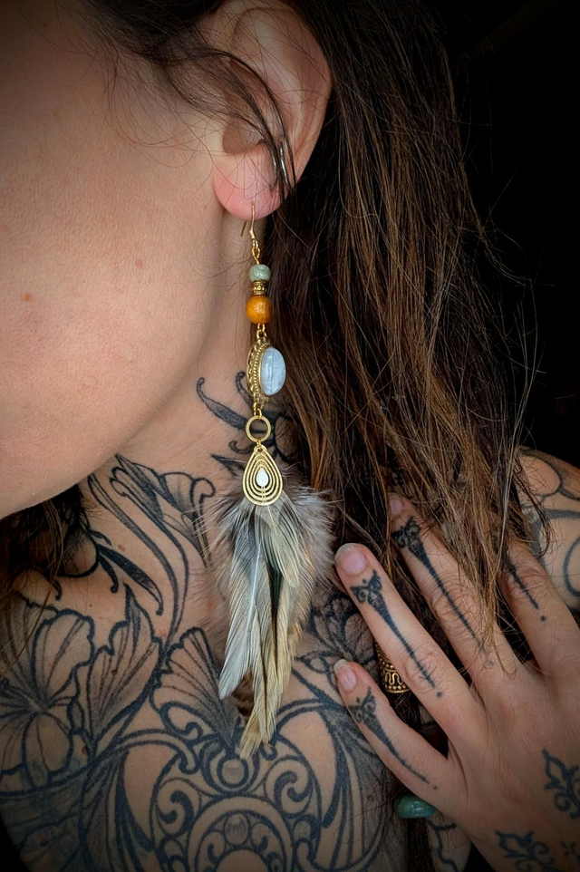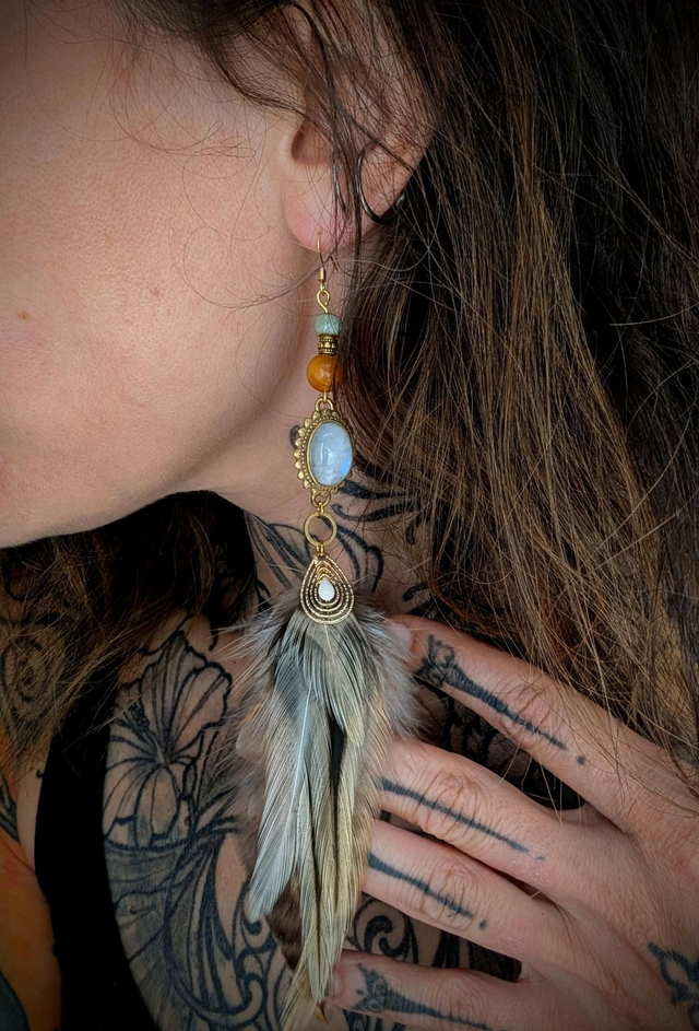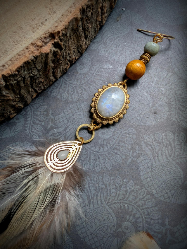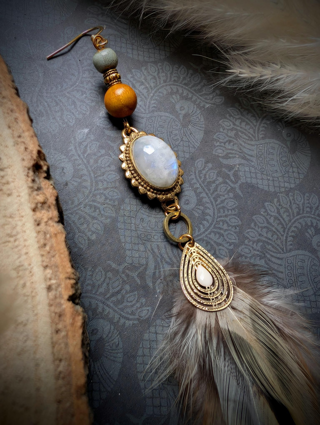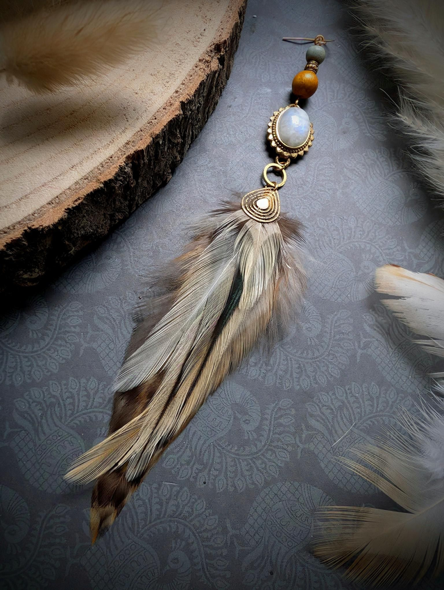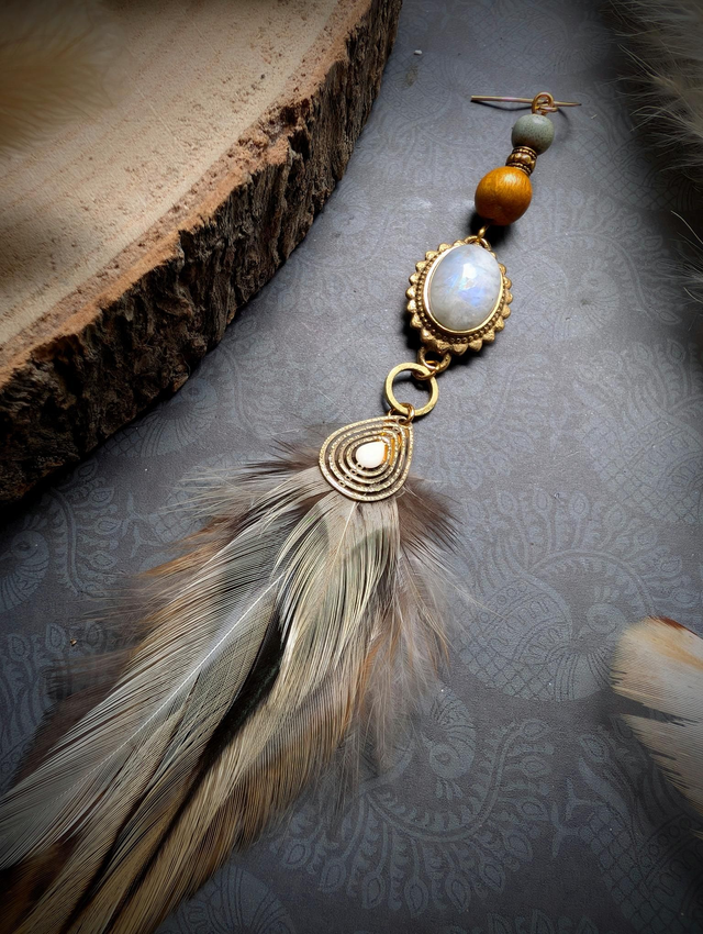 Le laiton doré, tel un rayon lunaire, met en valeur la pierre irisée, tandis que les plumes, légères comme un souffle, rappellent le murmure des forêts nocturnes.