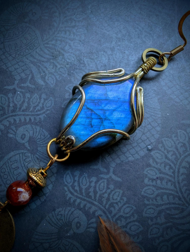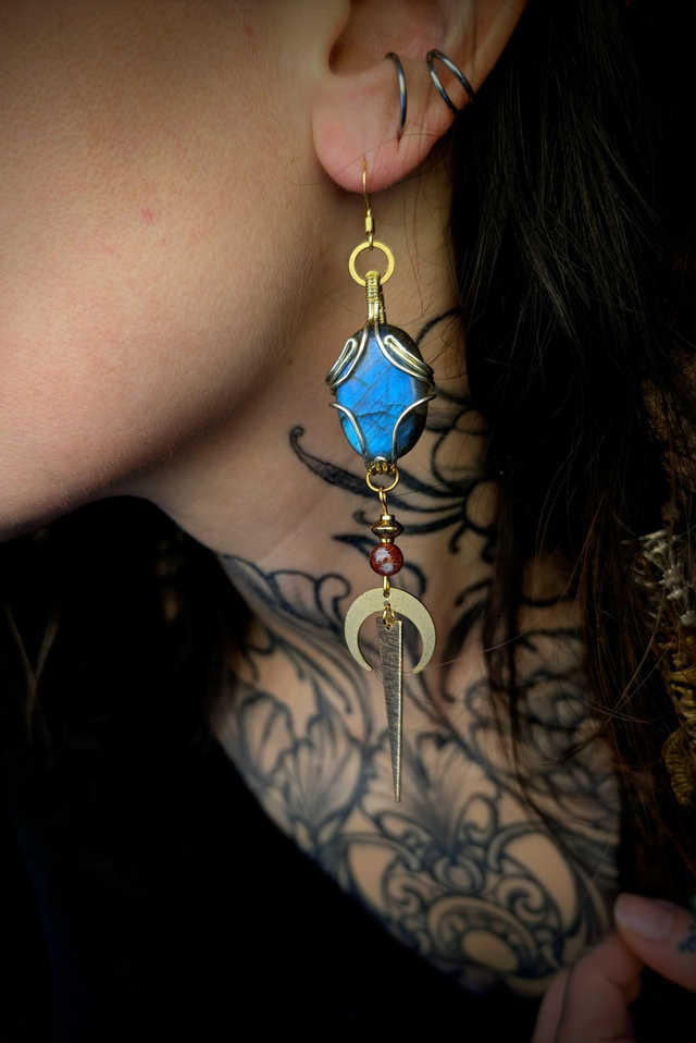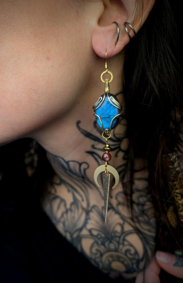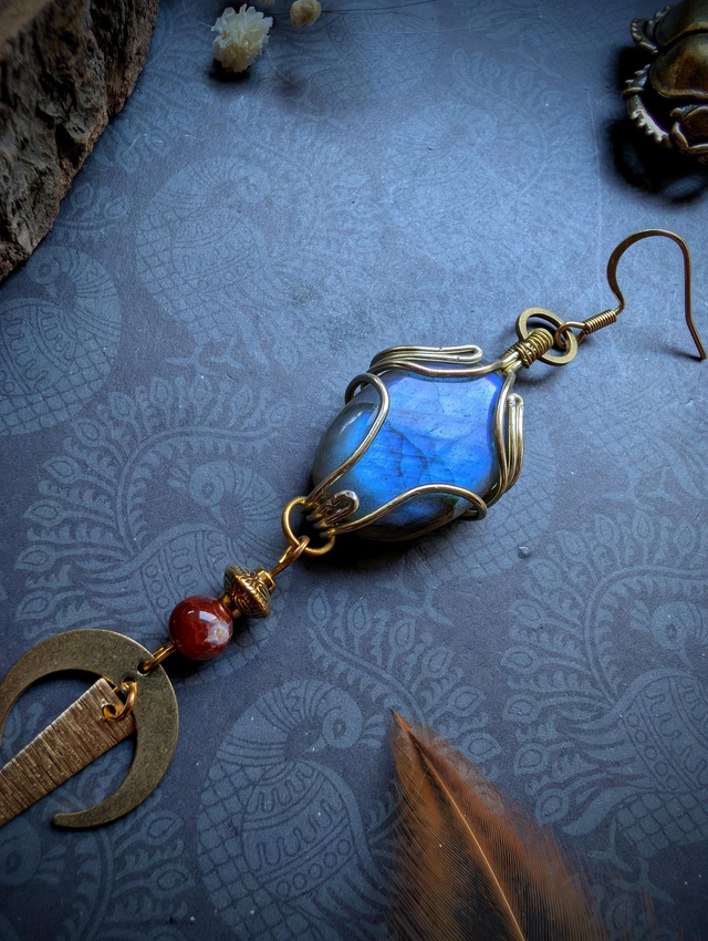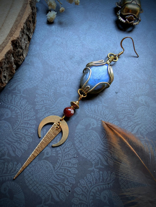 Une labradorite aux reflets bleutés sert de pièce centrale à cette boucle.