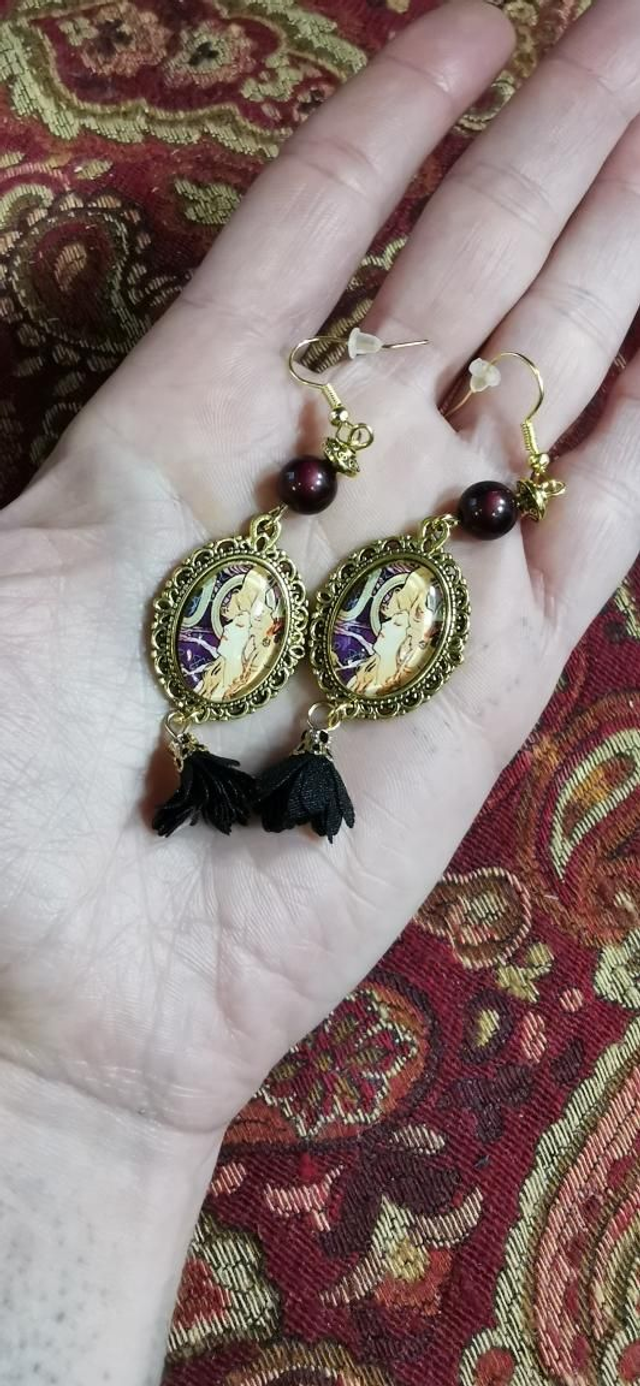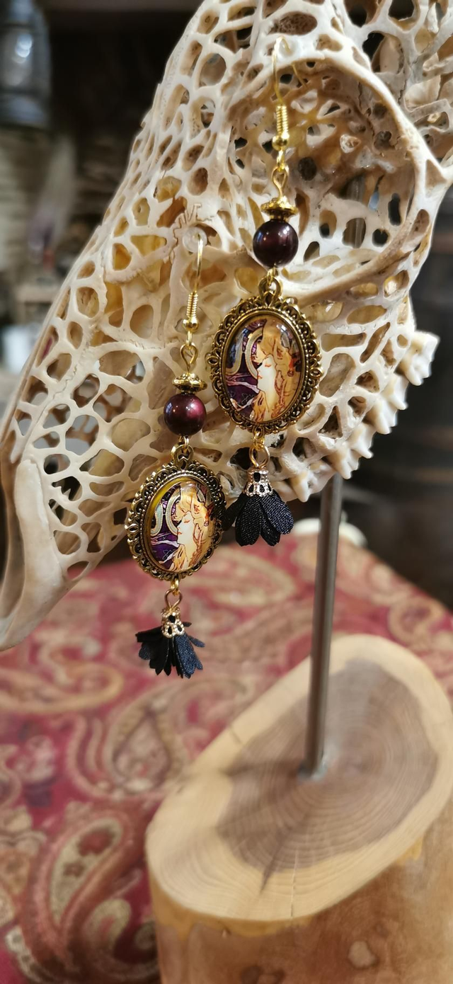 Boucles d'oreilles composées de petit cabochon en verre Mucha. Elles sont agrémentées de petit pompon et de perles en acrylique.