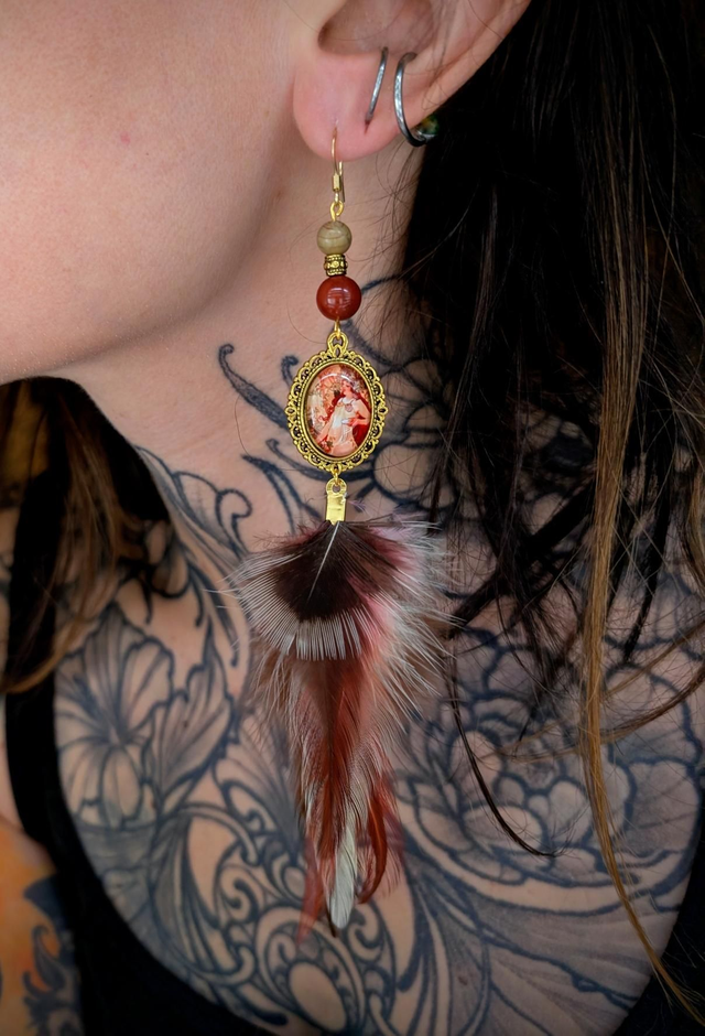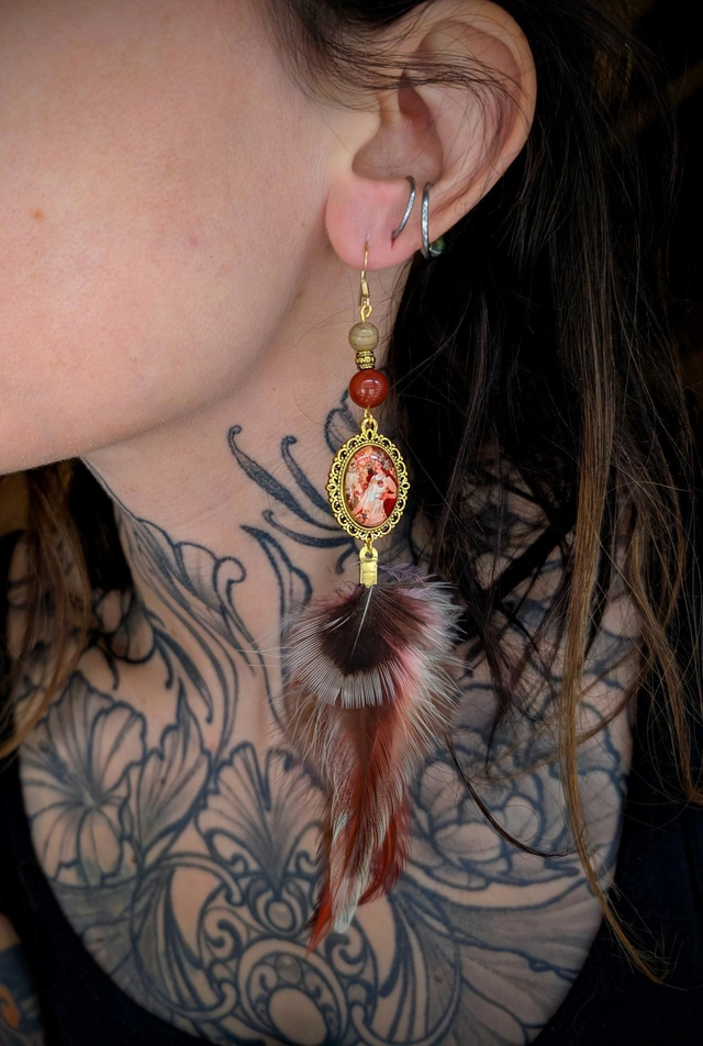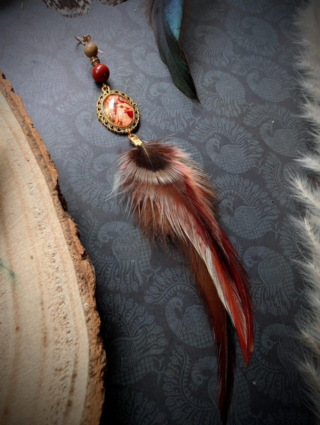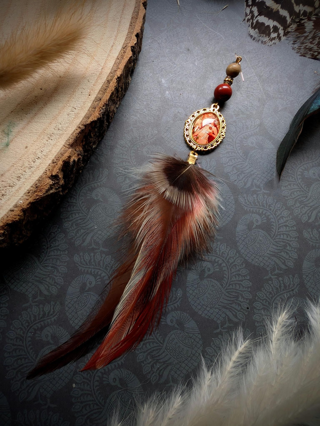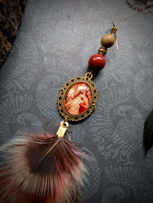 Les teintes chaudes et terreuses des plumes, associées au cabochon aux accents carminés, rappellent la lumière dorée des affiches de Mucha au coucher du soleil.