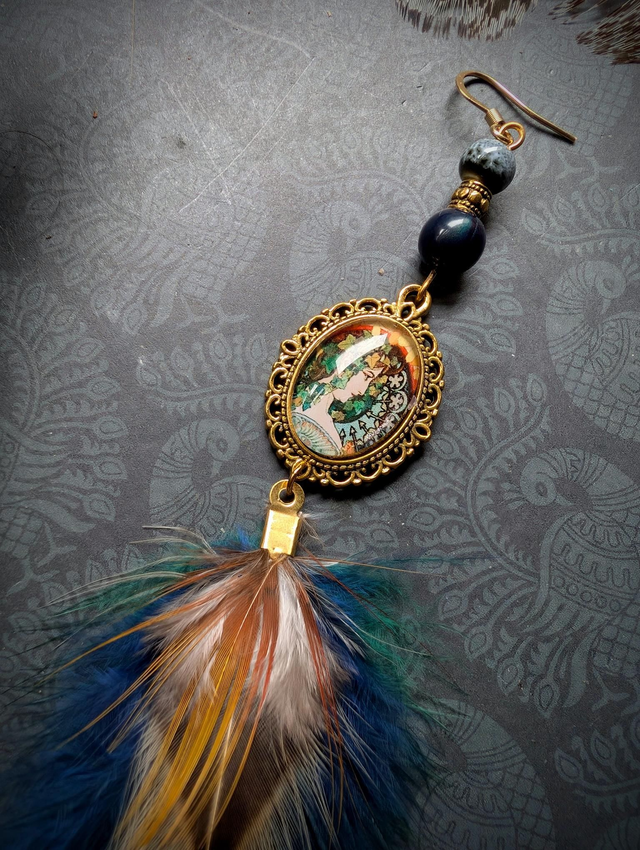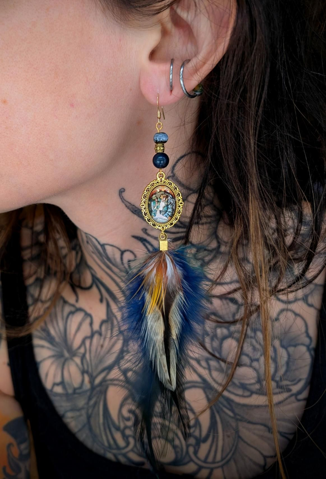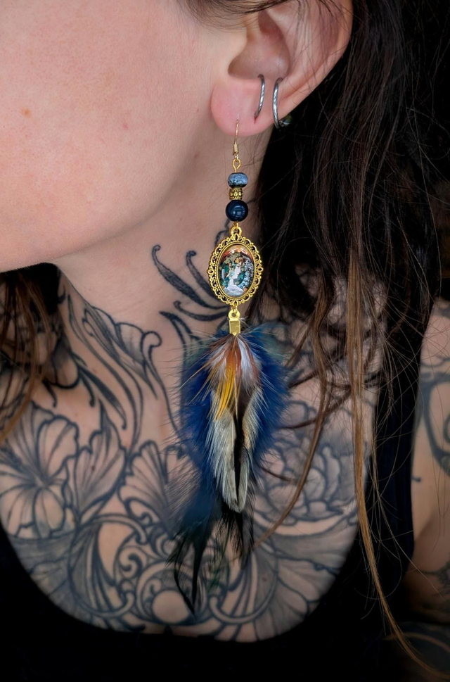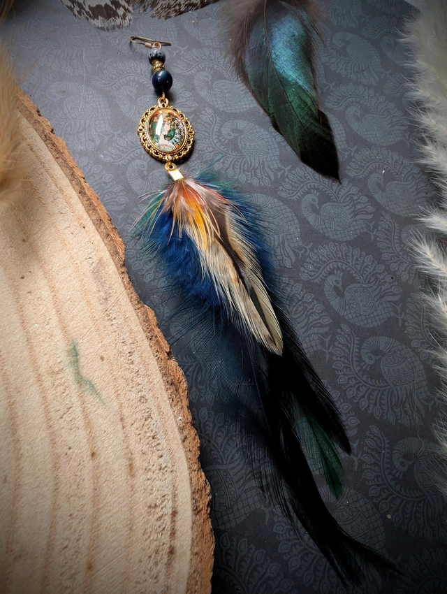 Les plumes aux nuances vert émeraude, bleu profond et or lumineux rappellent la luxuriance d’un jardin onirique. Une ode à la nature vivante et à la muse éternelle qui inspire l’art.