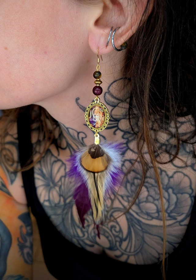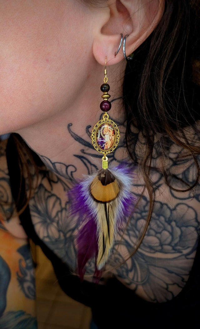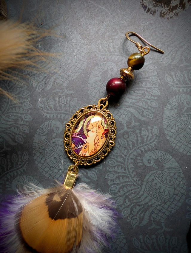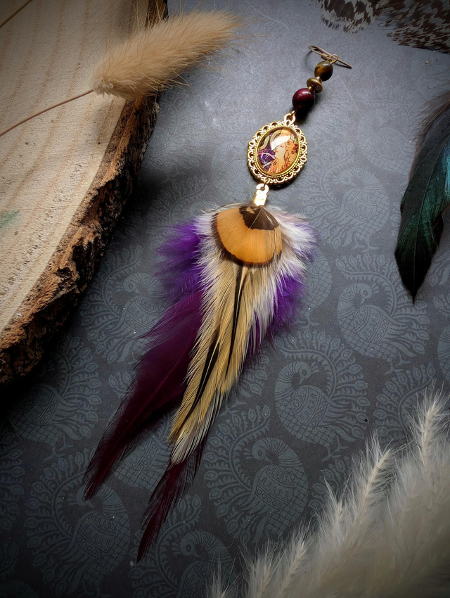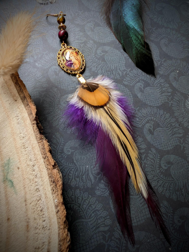 Ce bijou aux plumes violettes et dorées rappelle l’élégance des figures féminines nocturnes de Mucha, baignées de mystère et de poésie. Le cabochon doré encadre une muse délicate, comme une apparition sortie d’un rêve. Une pièce unique, talisman de l’intuition et de l’imaginaire.
