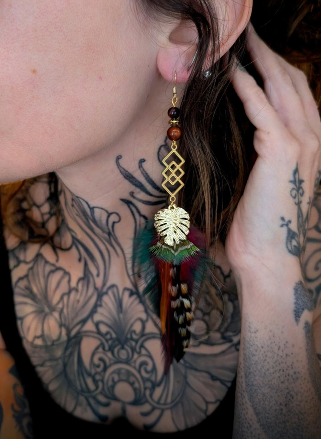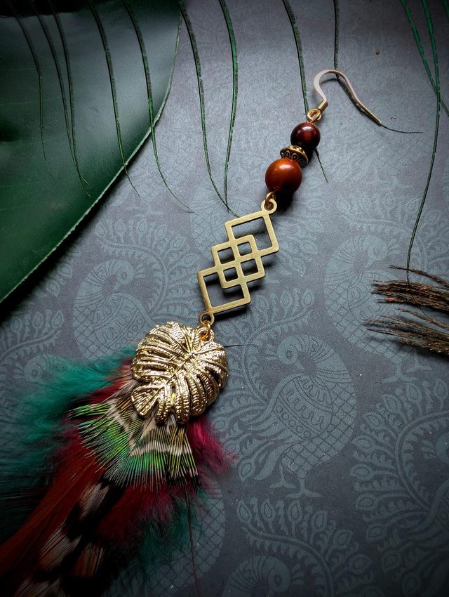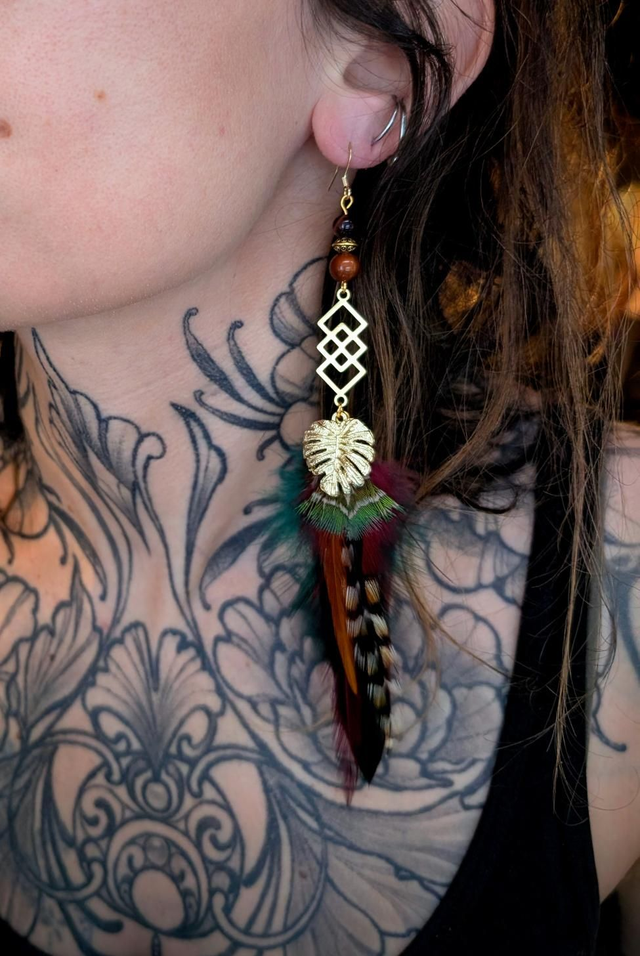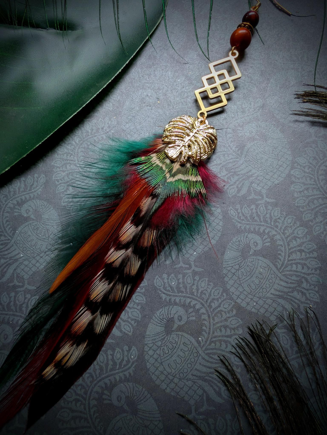 Les plumes rayées symbolisent la ruse et la force, tandis que la feuille de Monstera dorée protège ceux qui marchent entre les mondes.