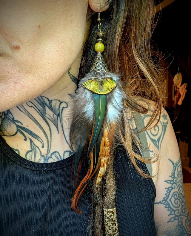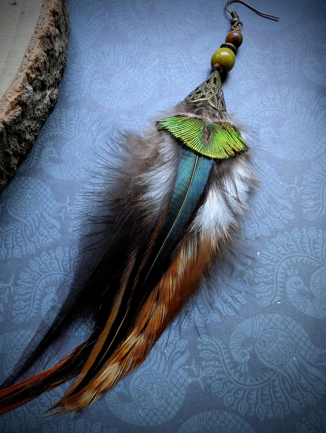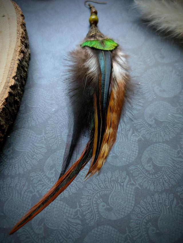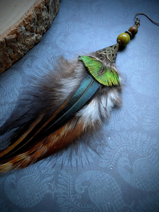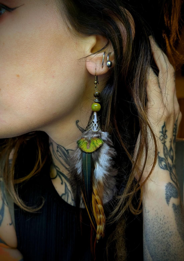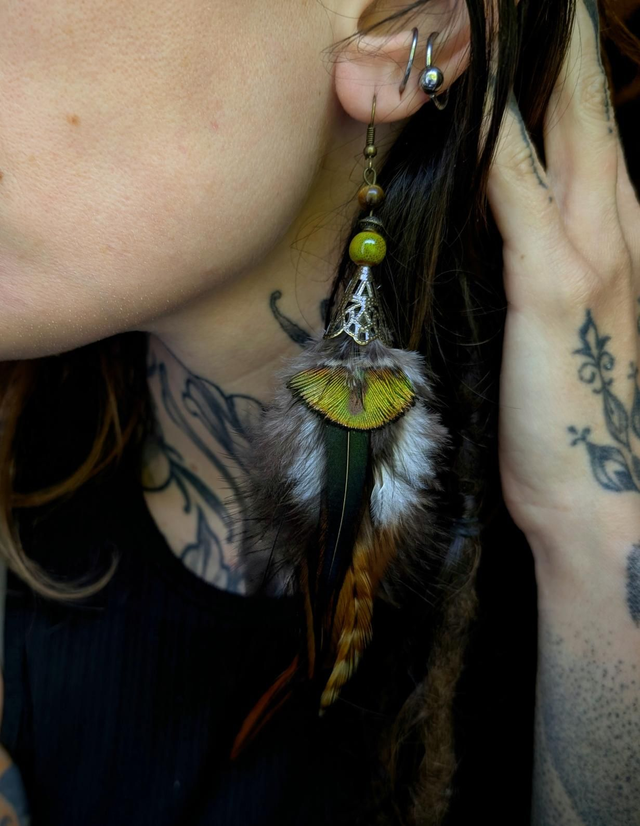 Les perles vert olive et tigrées, associées à l’attache en laiton vieilli, ajoutent une touche tribale subtile.
