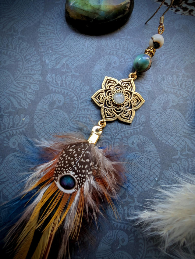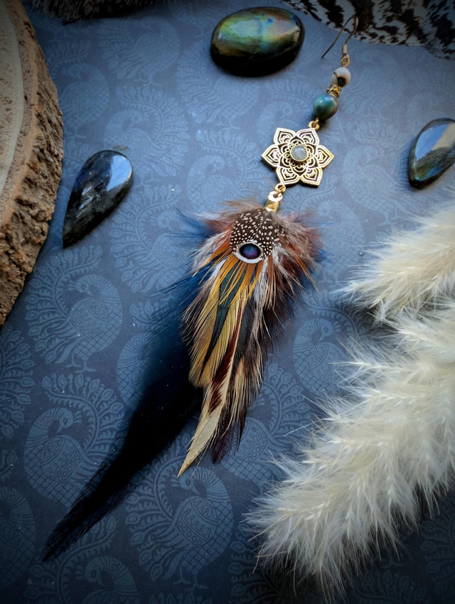 Nérée combine la délicatesse de la pierre de lune à la richesse des plumes colorées. Cette pierre est appréciée pour instaurer calme et équilibre, tout en accompagnant les variations émotionnelles avec douceur. Le pendentif floral doré et les nuances profondes des plumes lui donnent une allure plus marquée, élégante et expressive.