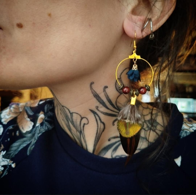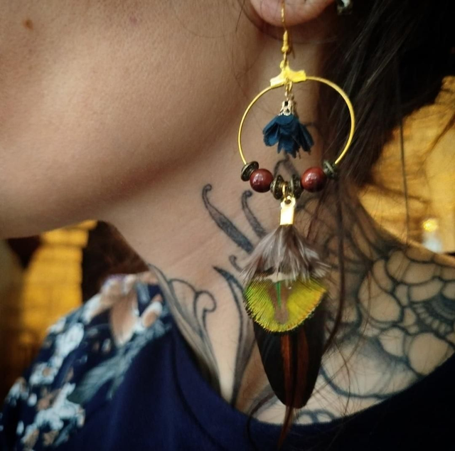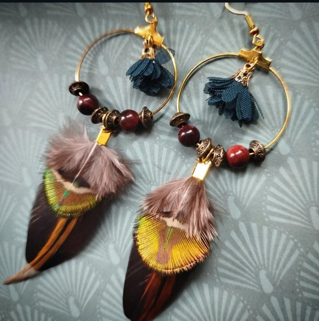 Boucles d'oreilles composées de plumes de paon avec d'incroyables reflets quand la lumière frappe dessus. Elles sont agrémentées de créoles et de perles en acrylique.