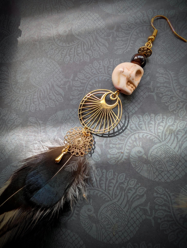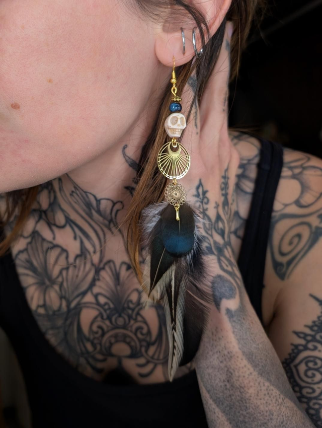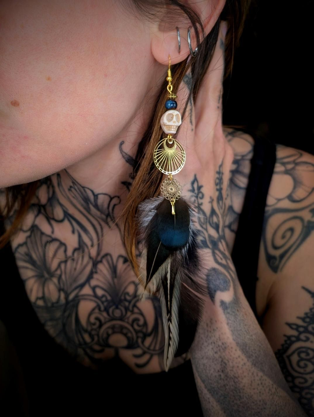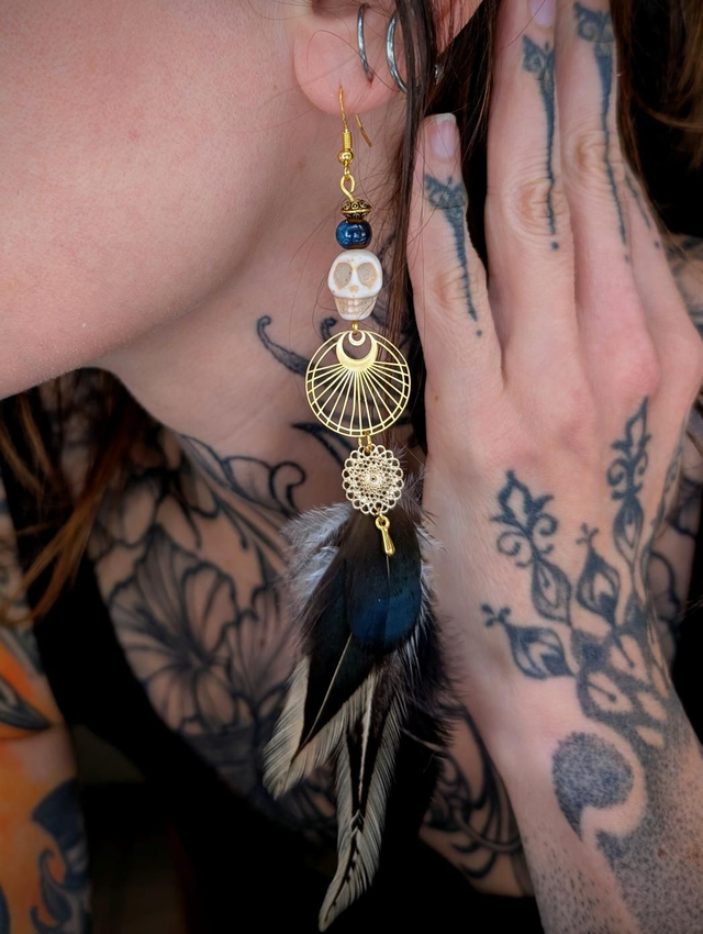 Telle une plume arrachée à l’obscurité elle-même, Nocturna est un talisman porté par les âmes nomades, les rêveurs éveillés et les veilleurs de l’ombre. Cette boucle d’oreille unique convoque l’énergie des forêts silencieuses et des rituels oubliés, fusionnant le sauvage au sacré.
