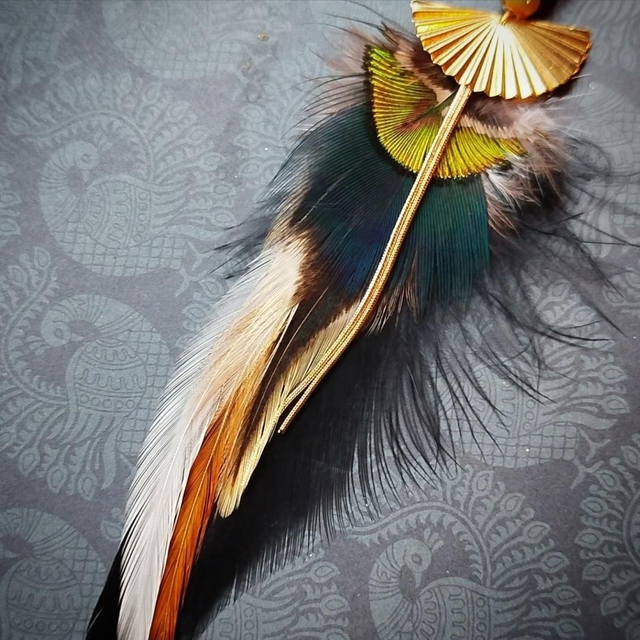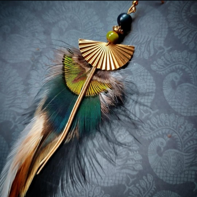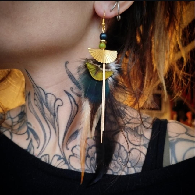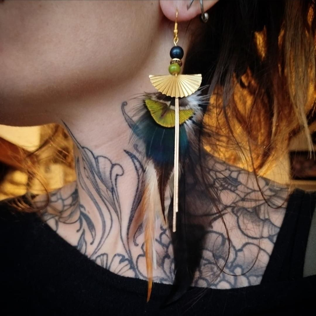 Boucles d'oreilles composées de plumes de coq et paon avec d'incroyables reflets quand la lumière frappe dessus. Elles sont agrémentées d'un petit éventail, une petite chaînette et d'une perle en acrylique et céramique.