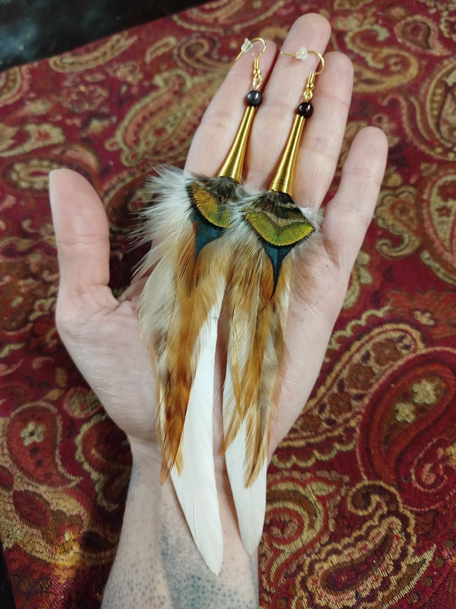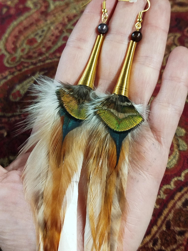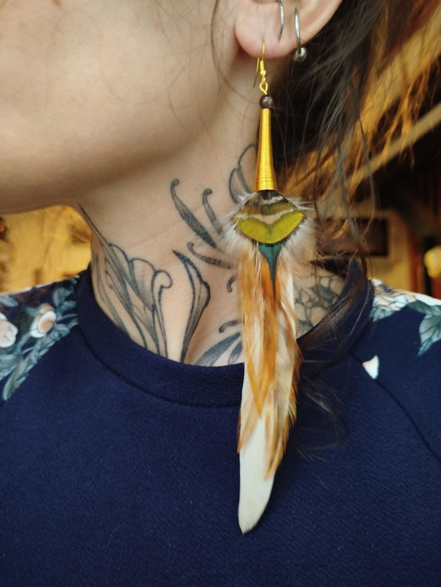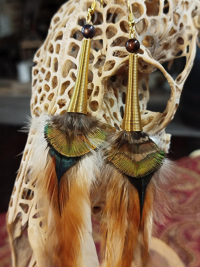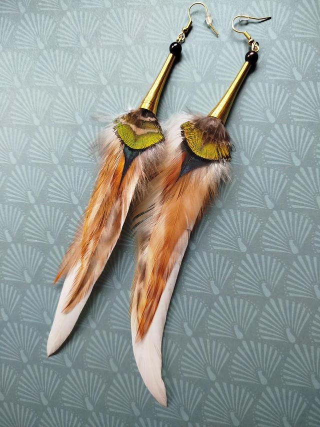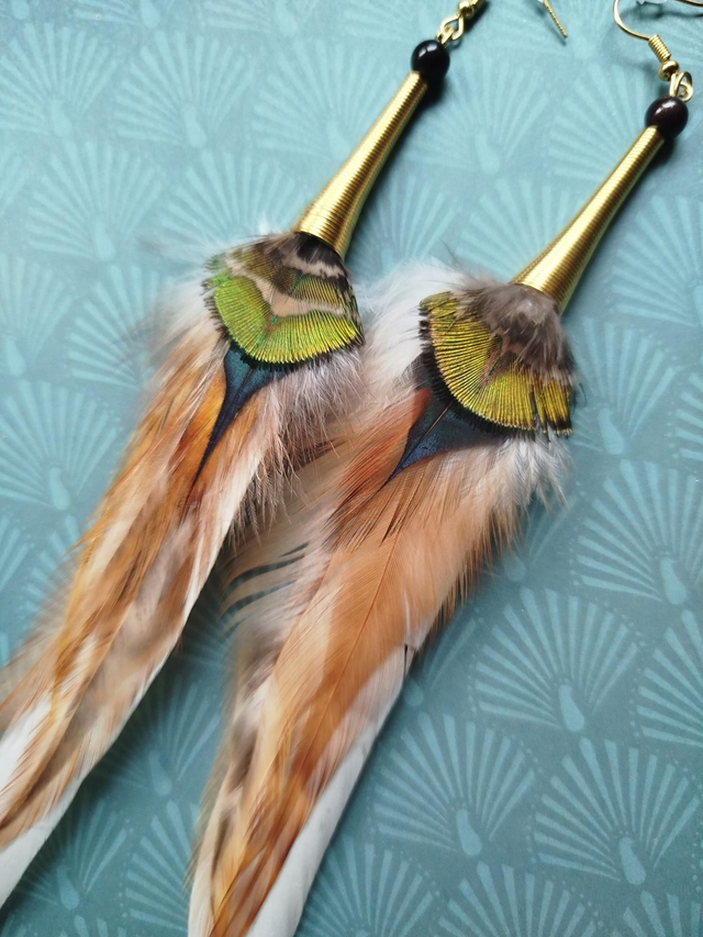 Boucles d'oreilles composées de plumes de paon et de coq avec d'incroyables reflets quand la lumière frappe dessus. Elles sont agrémentées d'une breloque ethnique et d'une perle en acrylique.