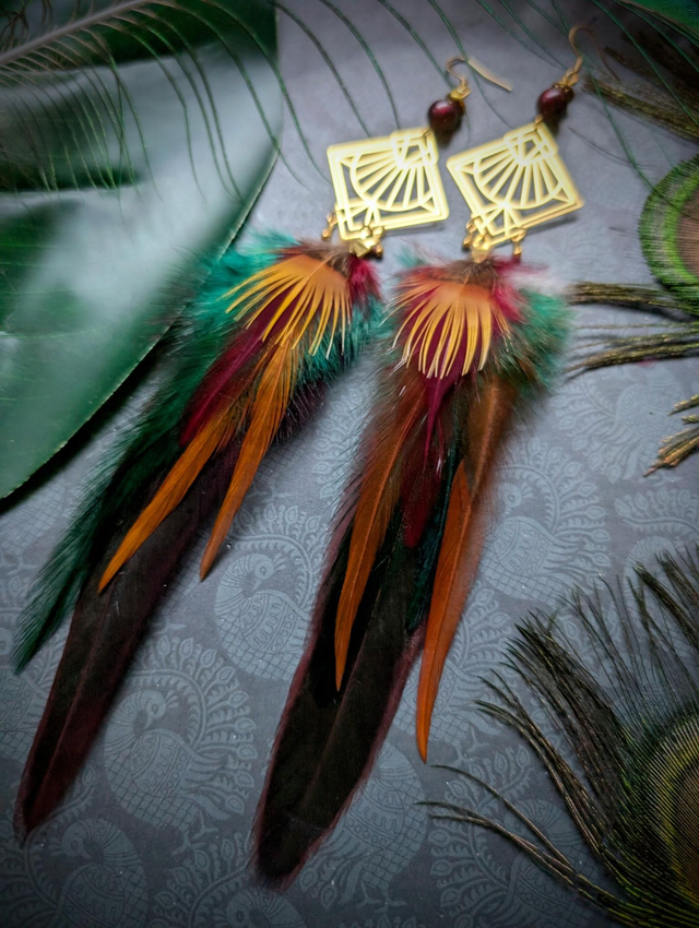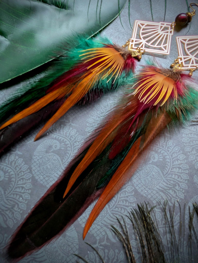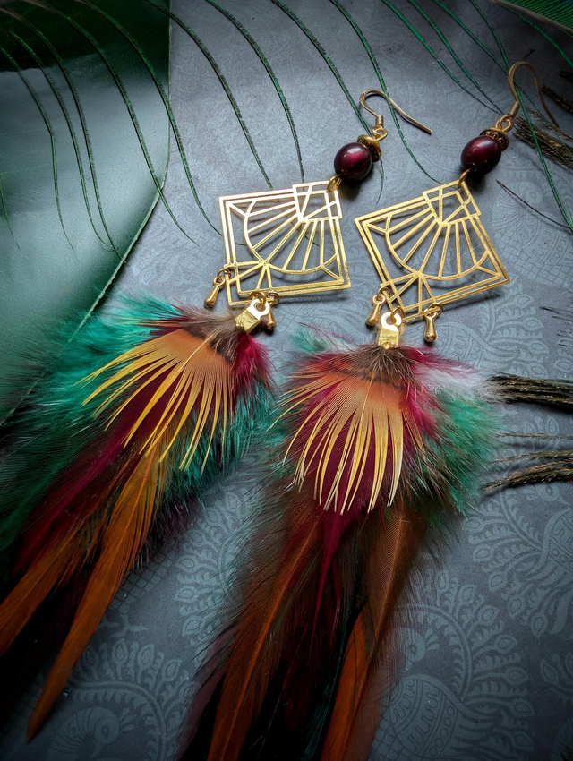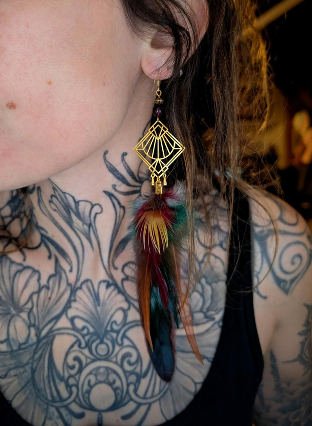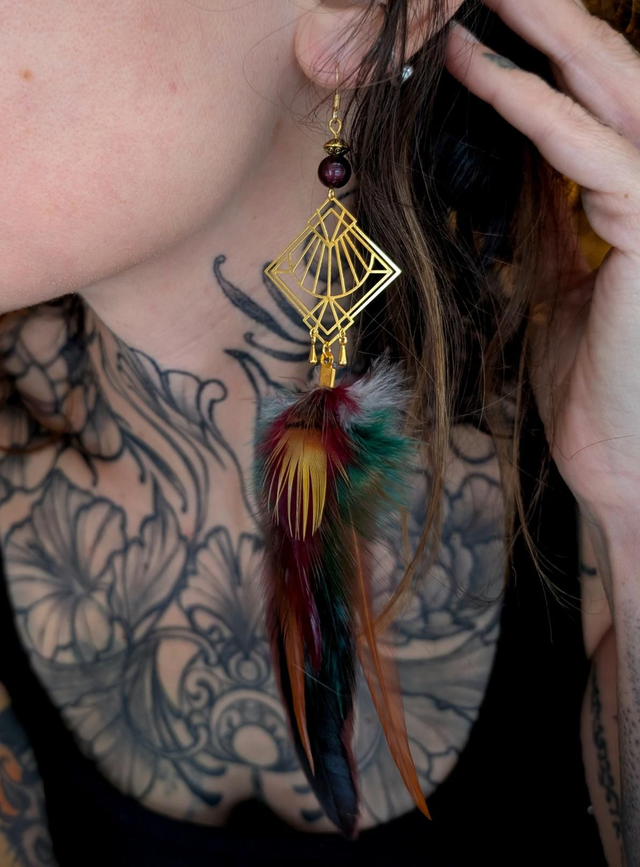Parure d’oiseau flamboyant, Sairani évoque les danses sacrées au cœur de la forêt. Les plumes multicolores murmurent des légendes anciennes, entre feu et feuille, entre ciel et peau.