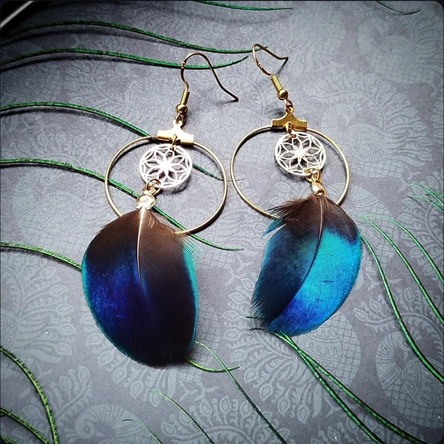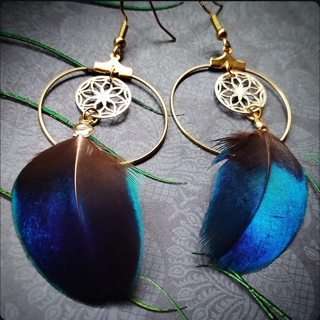Ces boucles d'oreilles sont faites avec les plumes de mes paons, Loki et Curly qui mon fait cadeau chaque été de ces merveilles.