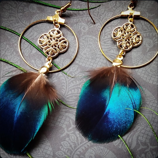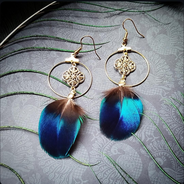 Ces boucles d'oreilles sont faites avec les plumes de mes paons, Loki et Curly qui mon fait cadeau chaque été de ces merveilles.